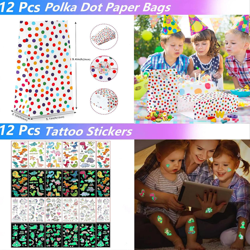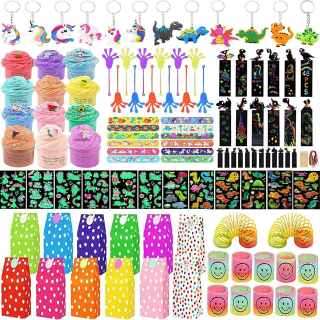Colorful Birthday Party Fidget Toys Bulk Party Favors for Kids De unicorn keychains,unique Luminous Tattoos for Kids,dinosaur keychains and Magic Scratch Rainbow Bookmarks,their unique pattern designs goodie bag stuffers,bright colors,bring endless fun to kids.Spring Rainbow Party Favor,Slap Bracelet,sticky hands for kids which can train the bab finger dexterity and body coordination very well.