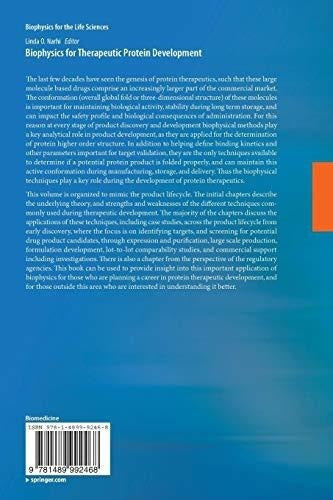 Biofísica para el desarrollo de proteínas terapéuticas (Biofísica para las ciencias biológicas (4)) Edición 2013 por Linda O. Narhi (Redactora) Este libro se puede utilizar para proporcionar información sobre esta importante aplicación de la biofísica para quienes están planeando una carrera en el desarrollo terapéutico de proteínas y para quienes están fuera de esta área y están interesados ??en comprenderla mejor. Los capítulos iniciales describen la teoría subyacente y las fortalezas y debilidades de las diferentes técnicas comúnmente utilizadas durante el desarrollo terapéutico. La mayoría de los capítulos discuten las aplicaciones de estas técnicas, incluidos los estudios de casos, a lo largo del ciclo de vida del producto desde el descubrimiento temprano, donde el enfoque está en la identificación de objetivos y la detección de posibles candidatos a productos farmacéuticos, a través de la expresión y purificación, la producción a gran escala, la formulación. desarrollo, estudios de comparabilidad de lote a lote y apoyo comercial, incluidas investigaciones. Tapa blanda: 302 páginas ISBN-10: 1489992464 Peso del artículo: 10,2 libras ISBN-13: 978-1489992468 Dimensiones del producto: 6.1 x 0.72 x 9.25 pulgadas Editorial: Springer; 2013a edición (6 de marzo de 2015) Idioma: inglés