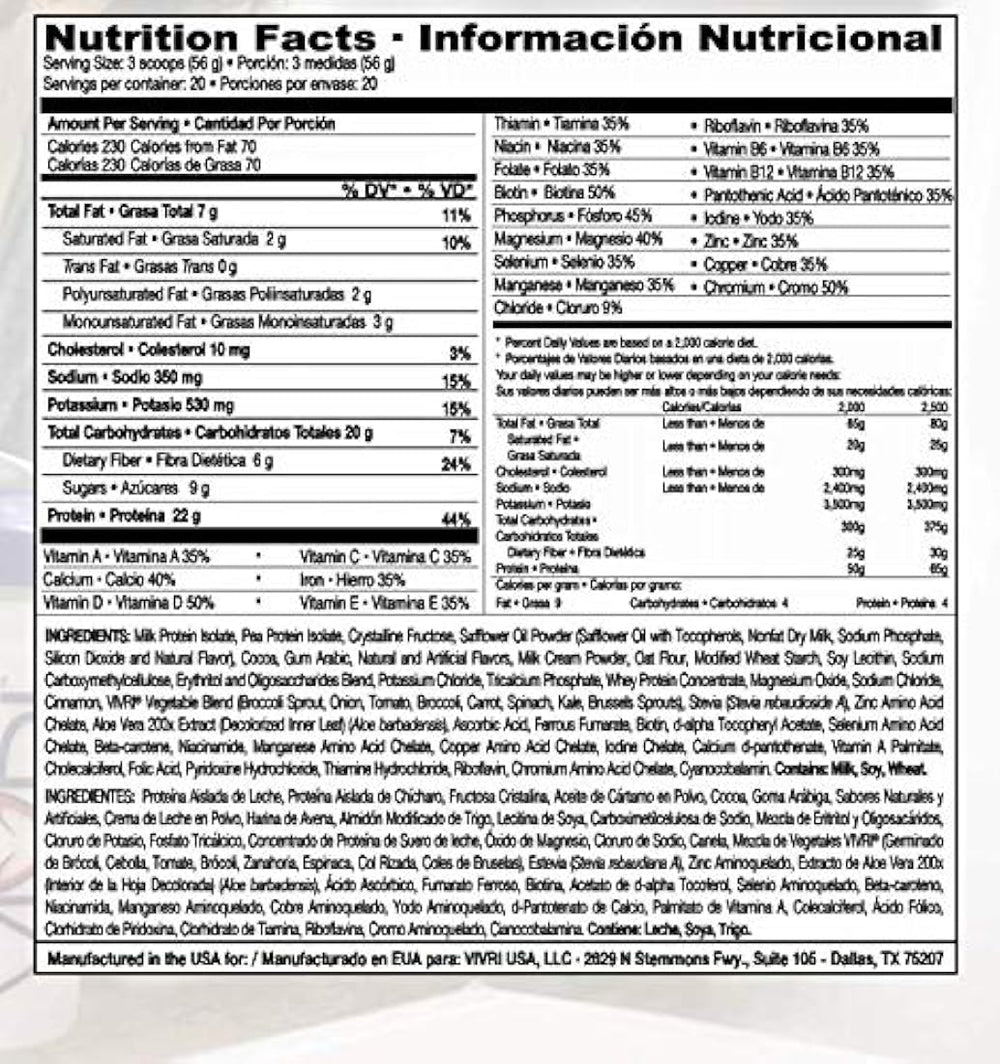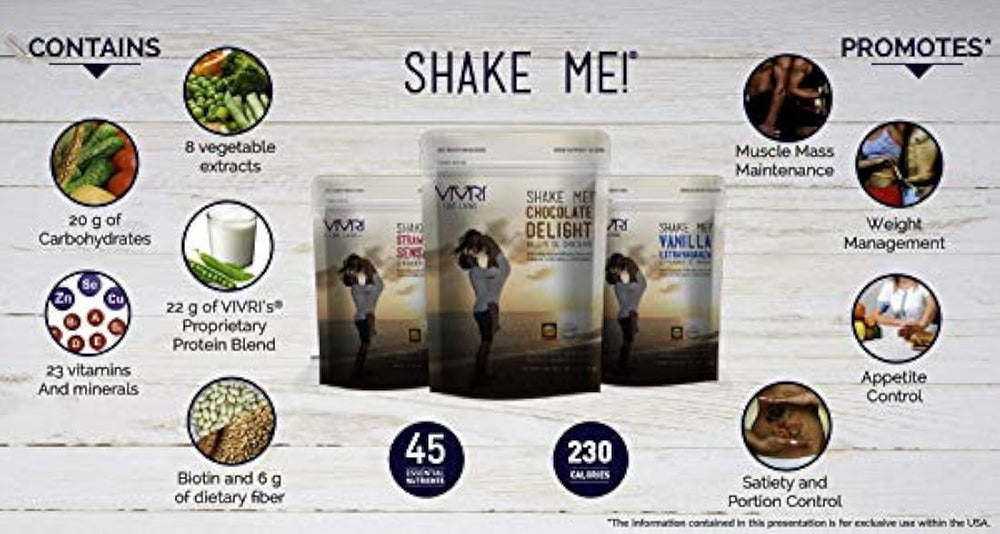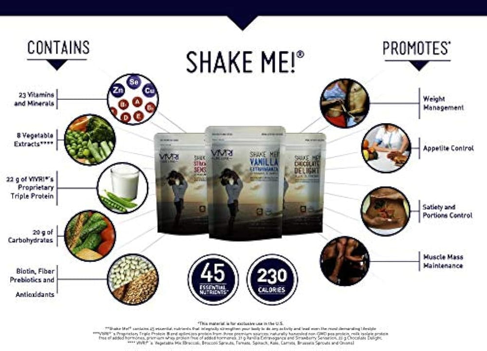 *** Características *** ¡Agítame! ofrece la mejor nutrición que el mundo tiene para ofrecer de una manera deliciosa y emocionante! * En solo segundos y solo 230 calorías, su cuerpo obtiene todos los nutrientes de una comida completa de acuerdo con los más altos niveles internacionales de nutrición de países como Alemania, Francia, Inglaterra, Suiza, España, Canadá, Estados Unidos, y más de 20 países adicionales pertenecientes a la Unión Europea. POWER ME Estimula tu mente y cuerpo de una manera saludable para rendir mejor. ¡PUEDE ME! contiene una mezcla de energía patentada basada en guaraná, yerba mate y té verde. Su fórmula contiene 100 mg de cafeína, similar a la de una taza media de café; sin embargo, debido a su fórmula de aporte energético y a su vitamina B12 armonizada con otras vitaminas y minerales, te da hasta cuatro veces más energía que una taza de café normal. LIMPIE ME contiene prebióticos que estimulan el crecimiento y la actividad de las bacterias favorables en su cuerpo, fortaleciendo su flora intestinal, y aloe vera que facilita y restaura la digestión, múltiples beneficios para el cuerpo. Con este Vivri Shake podrás disfrutar de un delicioso desayuno en cuestión de segundos sin tener que cocinar y lavar platos. ¡Cada vez que me sacudas! recuerde que está excediendo de una manera positiva, el estándar de nutrientes que necesita su cuerpo. Resultados esperados: Si reemplazas dos comidas por día con VIVRI SHAKE ME! y seguir una dieta equilibrada que totaliza 1.200-1.500 calorías por día e incluye abundantes cantidades de frutas y verduras frescas, puede esperar perder 1 a 3 libras por semana. Para obtener los mejores resultados, incorpore el ejercicio moderado regular en su régimen (una hora al día, cinco días a la semana)