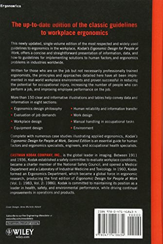 Escrito para aquellos que están en el trabajo pero no necesariamente ergonomistas capacitados profesionalmente, los principios y enfoques detallados en esta guía de gran prestigio se han implementado en entornos laborales del mundo real y han demostrado ser exitosos en la reducción del potencial de lesiones ocupacionales, aumentando el número de personas que pueden realizar un trabajo y mejorar el desempeño de los empleados en el trabajo. Más de 150 ilustraciones y tablas claras e informativas ayudan a transmitir datos e información en ocho secciones: Filosofía de diseño ergonómico Confiabilidad humana y transferencia de información Evaluación de demandas laborales Diseño de trabajo Diseño del lugar de trabajo Manipulación manual en tareas ocupacionales Diseño de equipos Ambiente
