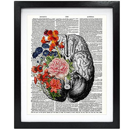 Lámina de cerebro humano sin marco con flores,diseño vintage