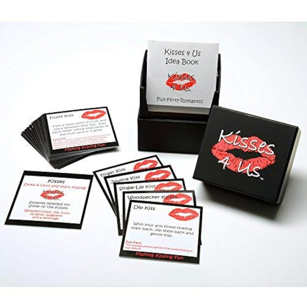 *** Características *** 30 tarjetas de beso: cada caja de Kisses 4 Us incluye 30 tarjetas de besos con detalles sobre cómo hacer 30 divertidos, coqueto, besos románticos con tu pareja. Cada tarjeta Kiss también tiene un hecho divertido o una sugerencia para mejorar cada experiencia de beso. Elige al azar una tarjeta de beso y sorprende lo que puedes elegir, un beso de mano, un beso de sendero o incluso un beso de carpintero. Una binación de divertidos, coquetos y románticos besos están incluidos en Kisses 4 Us! 5 Crea tus propias tarjetas: personaliza tu caja de besos con 5 tarjetas de besos "Crea tu propia".