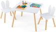 Color Blanco Costzon Talla 24.5” x 24.5” x 17” (L x W x H) Forma Cuadrada Dimensiones del artículo LxWxH 24,5 x 24,5 x 17 pulgadas Peso del artículo 19 Libras Se requiere ensamblado Sí Especialmente diseñado para niños: el juego de mesa y sillas para niños incluye 1 mesa cuadrada y 2 sillas a juego. La altura de la mesa es de 17 pulga mientras que la altura del asiento de la silla desde el suelo es de 10 pulga lo que es adecuado para niños de 3 a 6 años. Tu pequeño puede usarlos para co dibu estudiar o jugar. 2 sillas bonitas y ergonómicas: diseñadas con cómodos respaldos y asientos anc nuestras sillas de tamaño infantil protegen las espinas de los niños y garantizan su didad al sentarse. Los bonitos respaldos en forma de oreja de conejo también pueden atraer la atención de los niños. Mientras ta los bordes redondos sin rebabas evitan que la delicada piel de los niños se raye. Materiales seguros y de calidad: apoyado por patas de madera mac nuestro juego de muebles para niños de 3 piezas garantiza una alta durabilidad y una excelente robustez. Aparte d este juego de muebles también ha pasado las certificaciones ASTM y CP que es lo suficientemente seguro para que los niños lo usen. Juego práctico y que ahorra espacio: la mesa mide 24.5 x 24.5 x 17 pulgadas (largo x ancho x al mientras que cada silla mide 13 x 12 x 18.5 pulgadas (largo x ancho x alto). Puedes colocarlos en la habitación de los ni sala de jue sala de es aula o guardería. Ade gracias a su diseño que ahorra espa puedes empujar sillas debajo de la mesa o apilar sillas en la mesa cuando no estén en uso. Fácil de montar y limpiar: con un diseño fácil de instalar e instrucciones cla puede terminar el montaje en poco tiempo. Lo que debe hacer es insertar los respaldos de la silla y girar las patas en el sentido de las agujas del reloj. Ade la superficie lisa pintada se puede limpiar fácilmente.