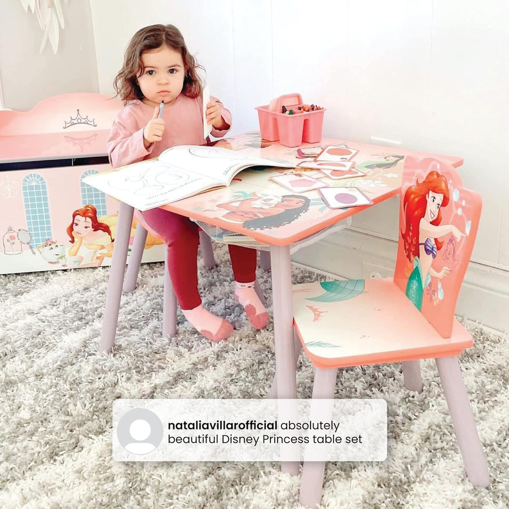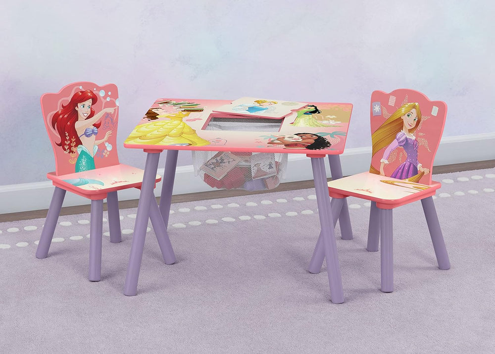 Qué incluye: el juego incluye una mesa y dos sillas; la mesa cuenta con un práctico juguete que se mantiene en el centro para un fácil almacenamiento Rango de edad: r ndado para niños pequeños y niños a partir de 3 años; cada silla soporta hasta 50 libras. Para los fanáticos de Disney Princess: este set cuenta con divertidos y coloridos gráficos de Cenicie Ar Mo Be Mulan y Rapunzel Construcción duradera: hecha de madera de ingeniería y madera maciza; acabado resistente a los arañazos que protege los gráficos coloridos de la mesa; fácil montaje TAMAÑO: Dimensiones montadas: 24"L x 24"W x 17.72"H
