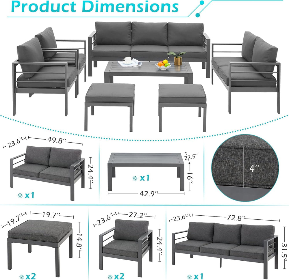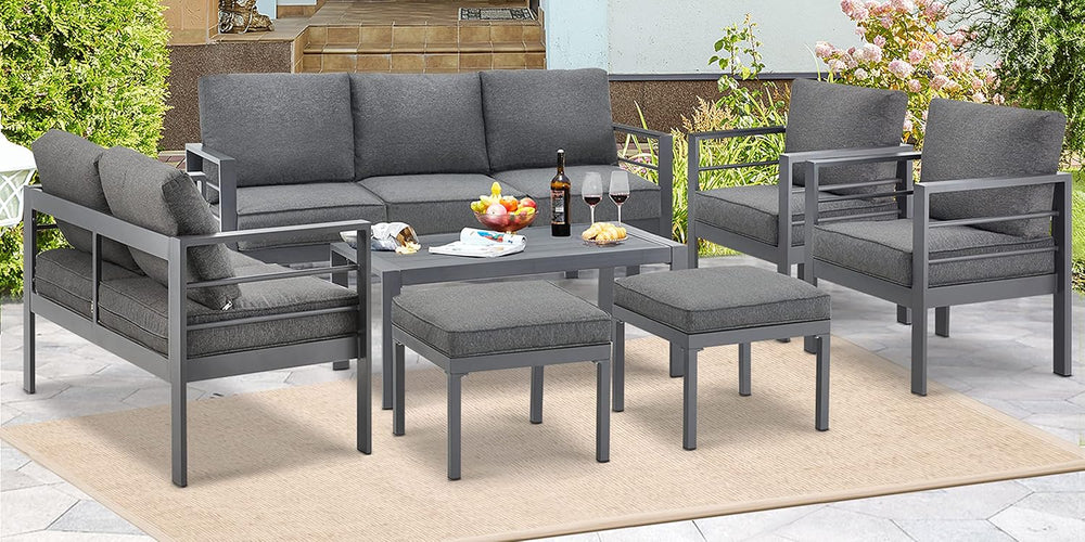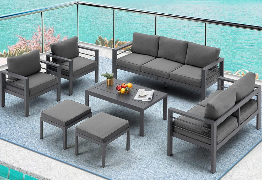 AECOJOY Muebles de patio modernos de aluminio con mesa auxiliar, juego de 7 piezas para conversación al aire libre con cojines gris oscuro para balcón, porche, césped y más