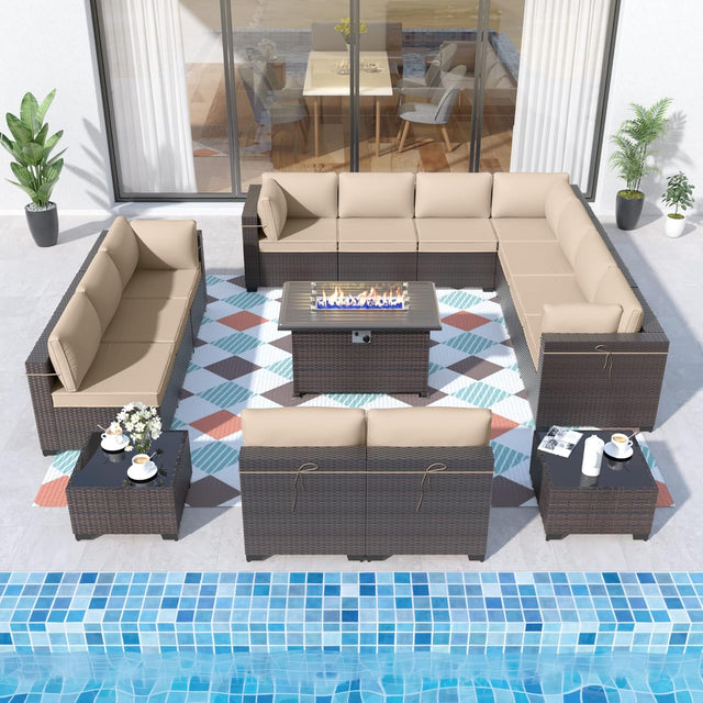 ALAULM Juego de 15 muebles de patio para exteriores con mesa para fogata de propano, sofás seccionales para exteriores, muebles de patio, fogata de gas de 43 pulgadas, juego de conversación de ratán de polietileno marrón con 12 cojines, arena está agotado y se enviará tan pronto como vuelva a estar disponible.