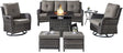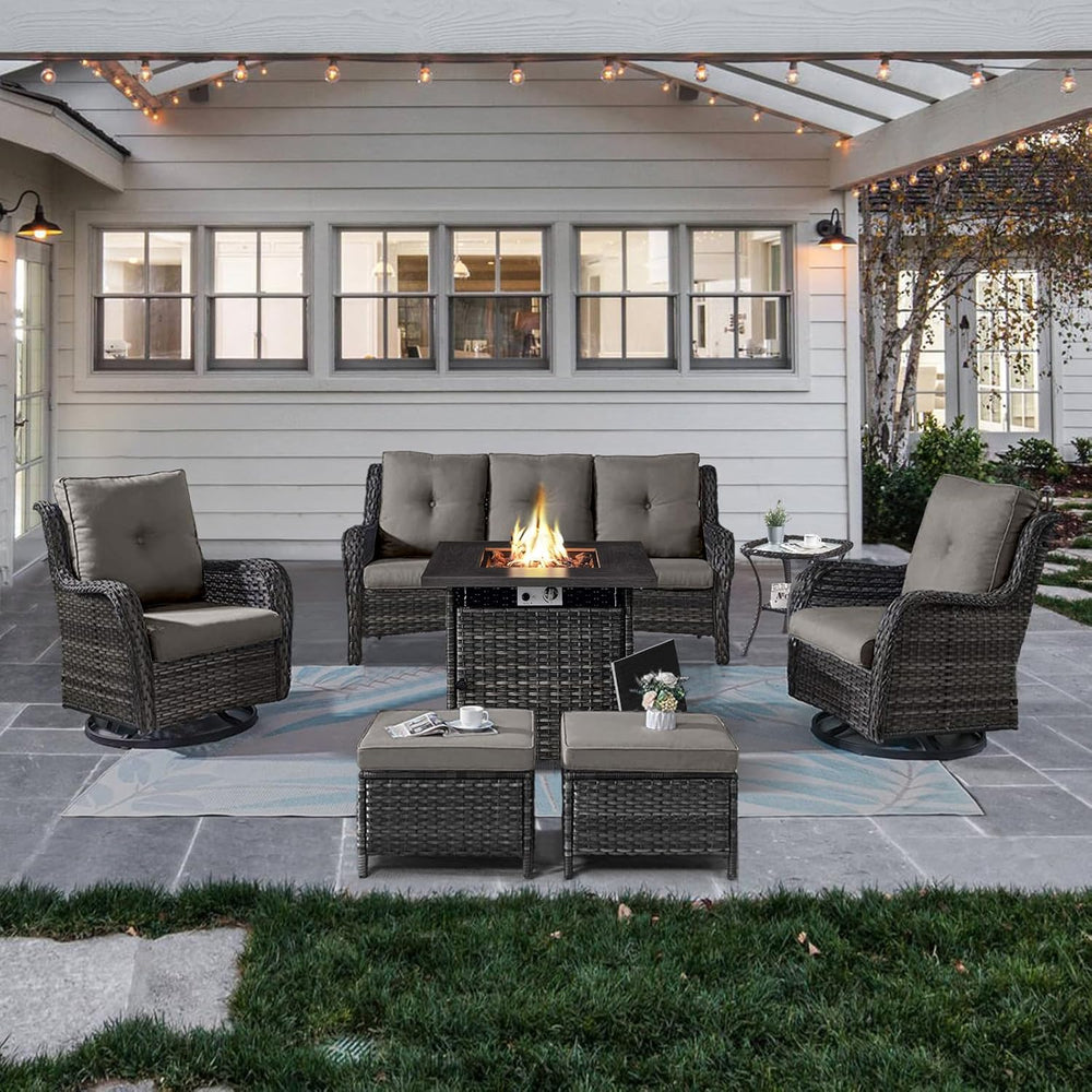 Belord Juego de muebles de patio al aire libre con mesa para fogata de propano, juego de conversación de mimbre de 7 piezas con 2 sillas giratorias mecedoras deslizantes, sofá de ratán, cojín gris,