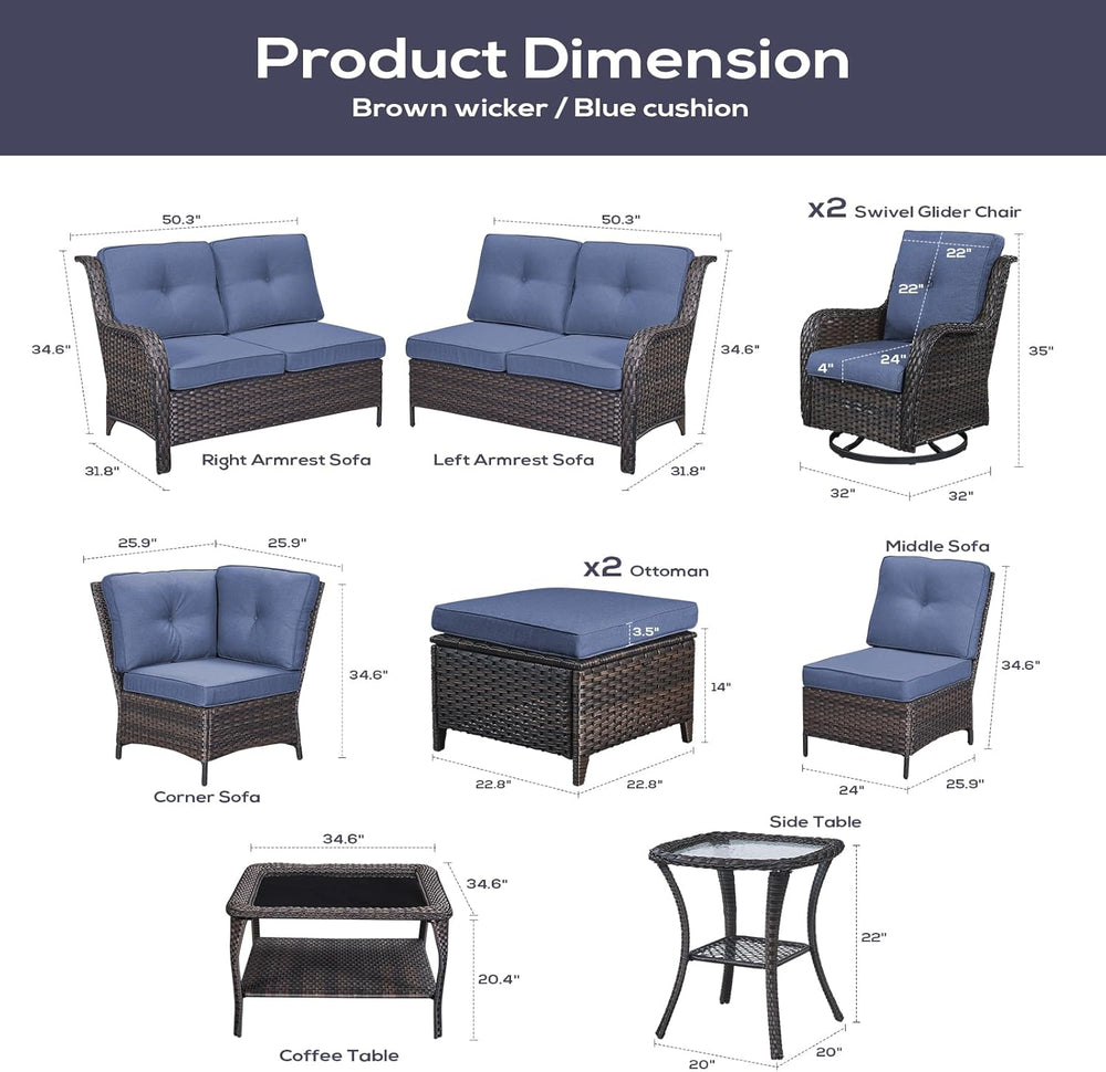 Belord Sofá seccional de muebles de exterior, sofá en forma de L, juego de mimbre para patio con 2 sillas deslizantes giratorias, juegos de conversación de ratán de 10 piezas con cojín azul para terraza, patio trasero, terraza y terraza