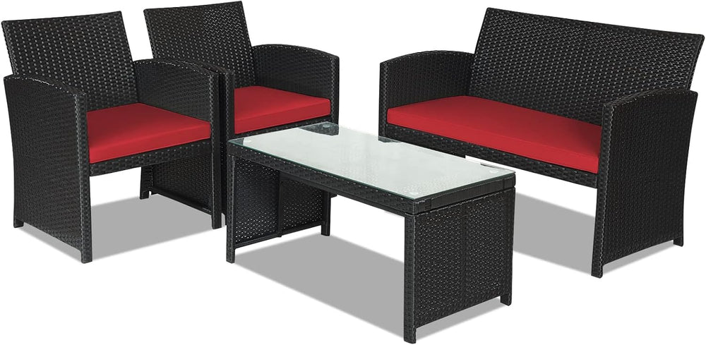 Goplus Juego de muebles de ratán para patio, 4 piezas, juego de sofá y mesa de mimbre para exteriores con cojines suaves y mesa de centro de vidrio templado para balcón, jardín, patio trasero (rojo)