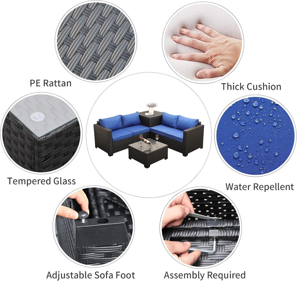 Juego de muebles de mimbre de polietileno para exteriores, 4 piezas, sofá de dos plazas seccionales de ratán negro, sofá de conversación con caja de almacenamiento, mesa superior de vidrio y cojín antideslizante azul rey está agotado y se enviará tan pronto como vuelva a estar disponible.