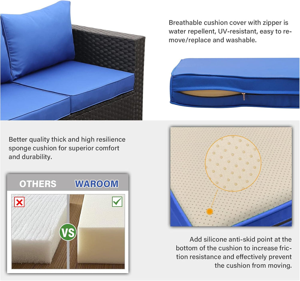 Juego de muebles de mimbre de polietileno para exteriores, 4 piezas, sofá de dos plazas seccionales de ratán negro, sofá de conversación con caja de almacenamiento, mesa superior de vidrio y cojín antideslizante azul rey
