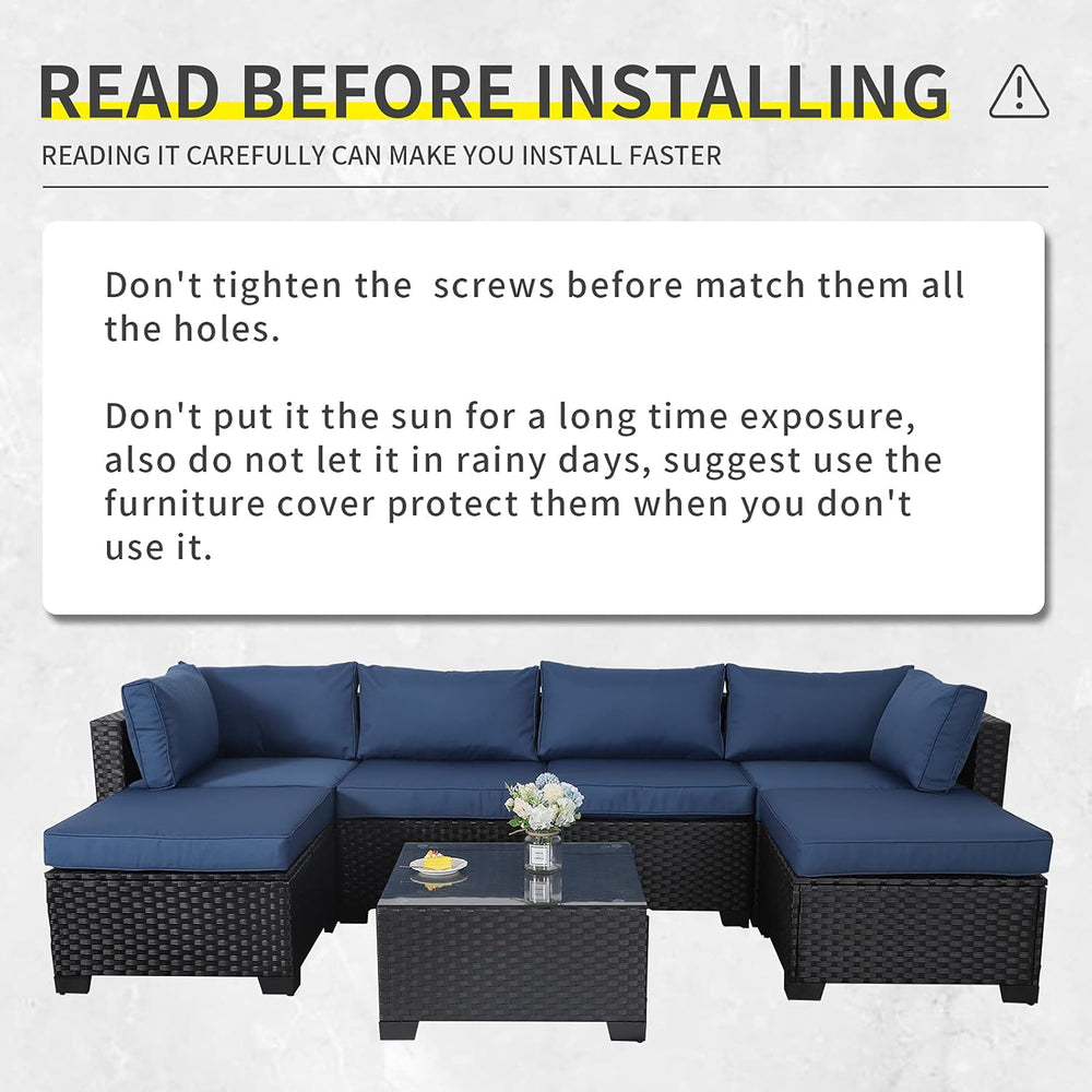 Lviden Juego de muebles de mimbre PE para exteriores, 7 piezas, juego de sofá de conversación seccional de ratán para patio, con cojines azul marino y mesa superior de vidrio