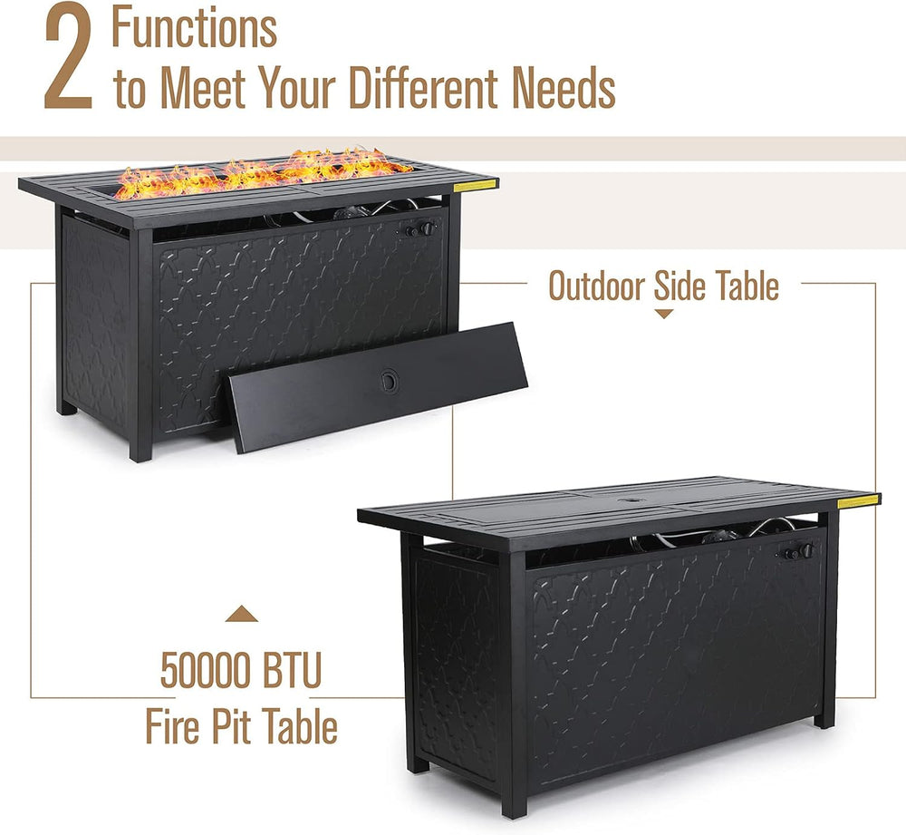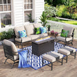 MFSTUDIO Juego de muebles de patio de 6 piezas con mesa de fogata de gas de 45 pulgadas (hasta 7 asientos), sofás de conversación de metal para exteriores con 1 sofá de 3 asientos, 2 sillas mecedoras y 2 otomanas