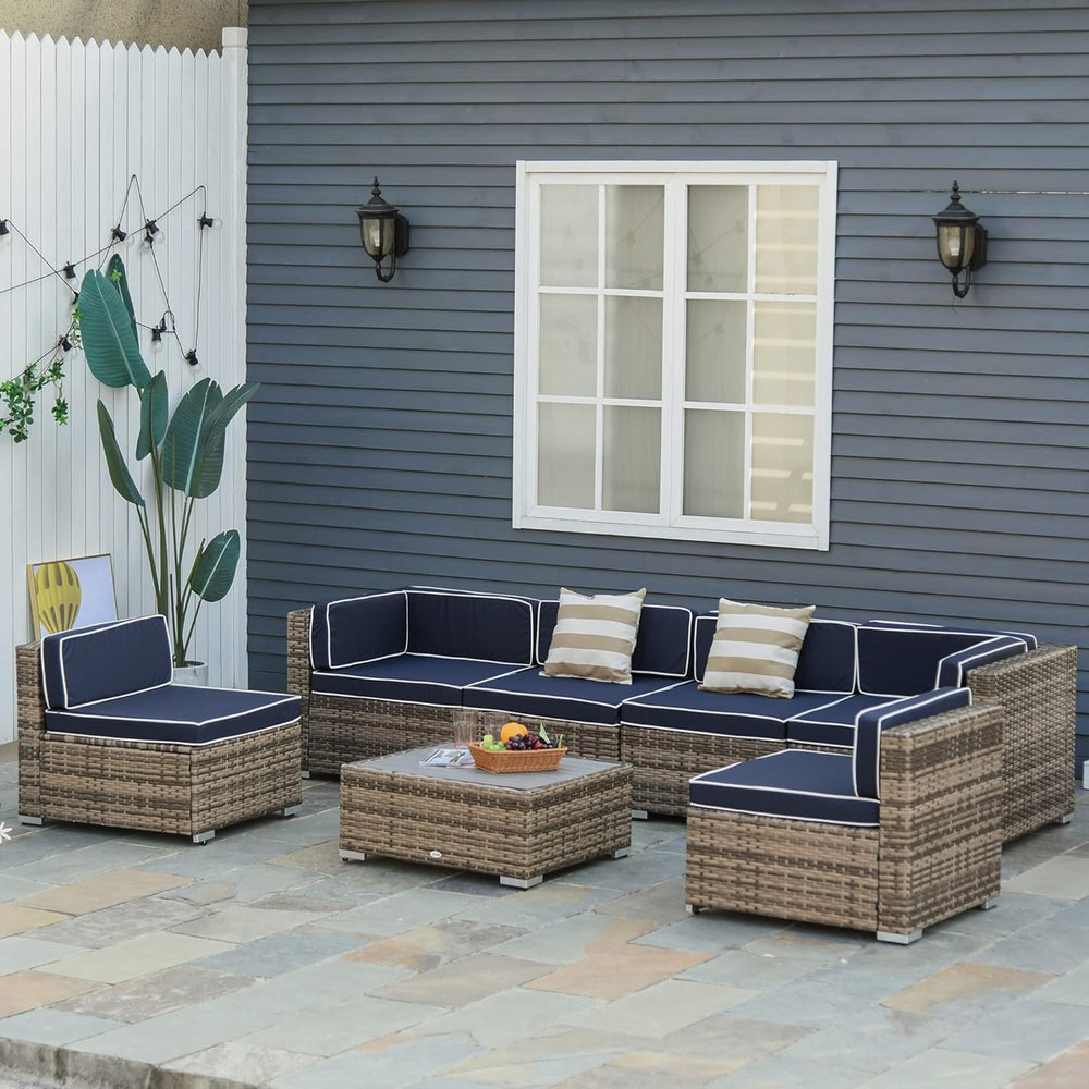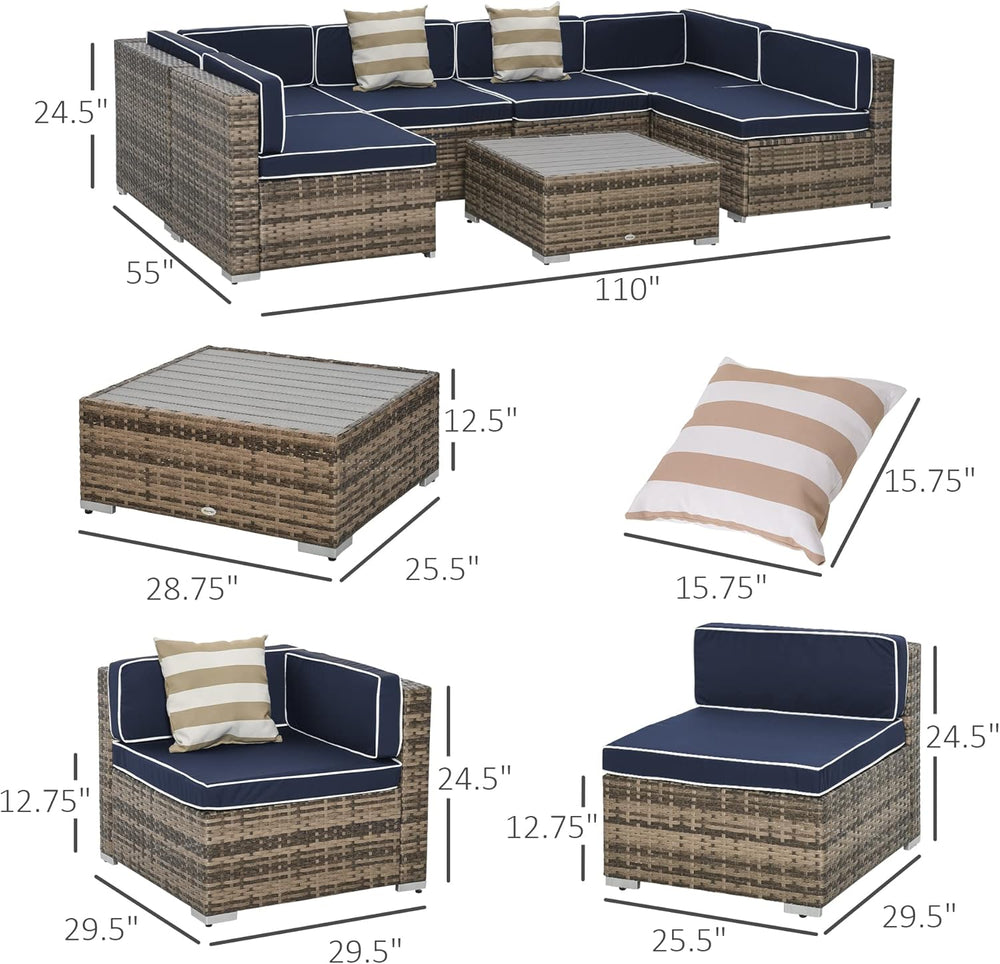 Outsunny Juego de muebles de patio de 7 piezas, juego de conversación de mimbre para exteriores, juego de sofá modular de ratán PE para todo tipo de clima, con cojines y mesa de madera sintética