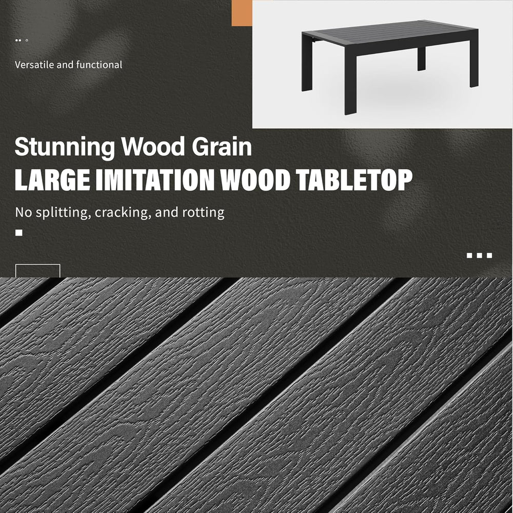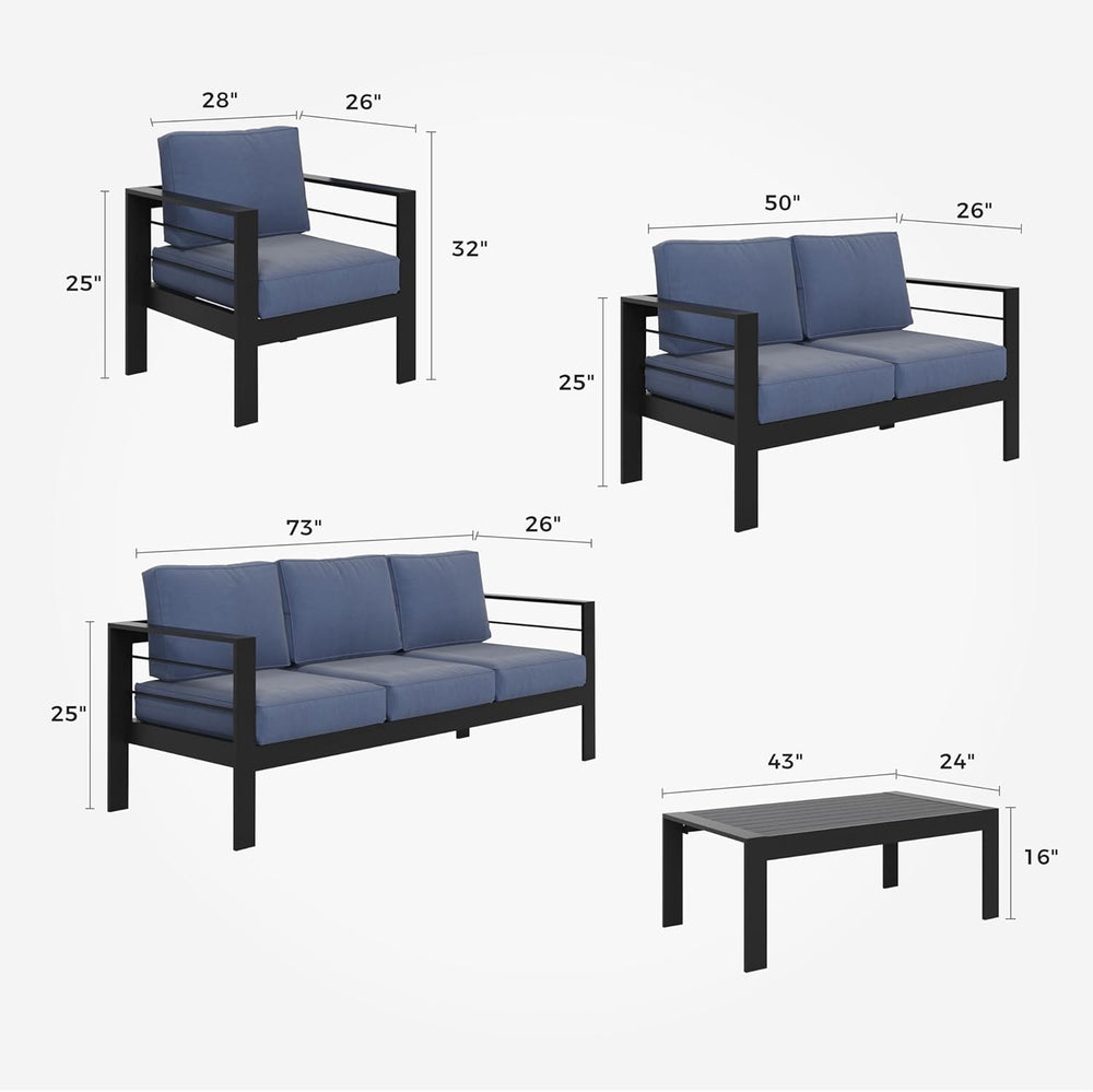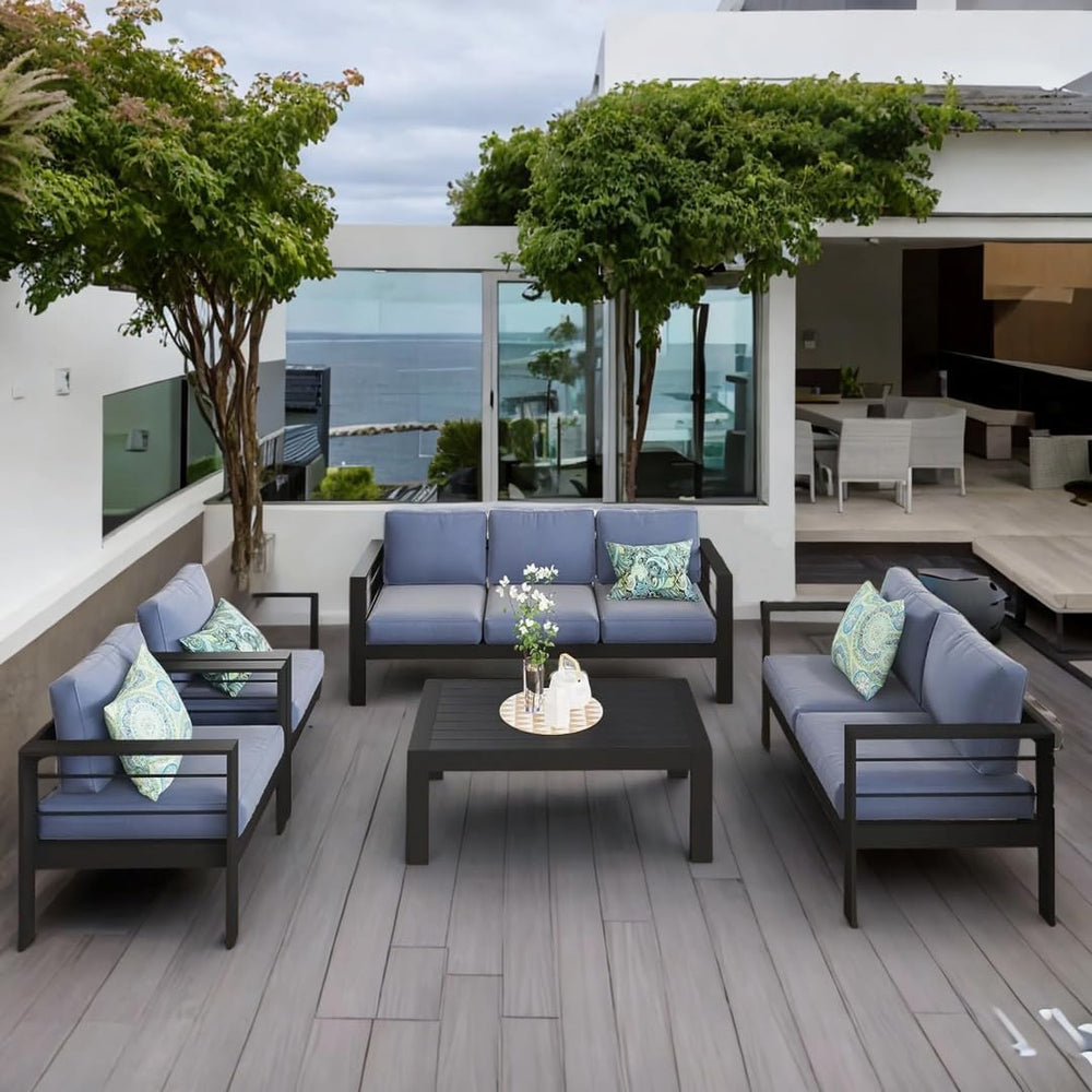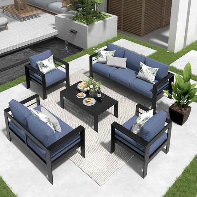 Solaste Juego de muebles de aluminio para patio, 5 piezas, moderno juego de conversación al aire libre, sofá seccional con cojín mejorado y mesa auxiliar, marco negro y cojín azul