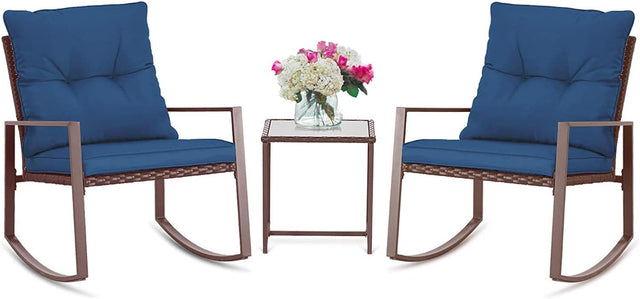 SUNCROWN Juego de 3 piezas para exteriores, muebles de mimbre negro, sillas de porche, juegos de conversación con mesa de café de cristal, azul oscuro