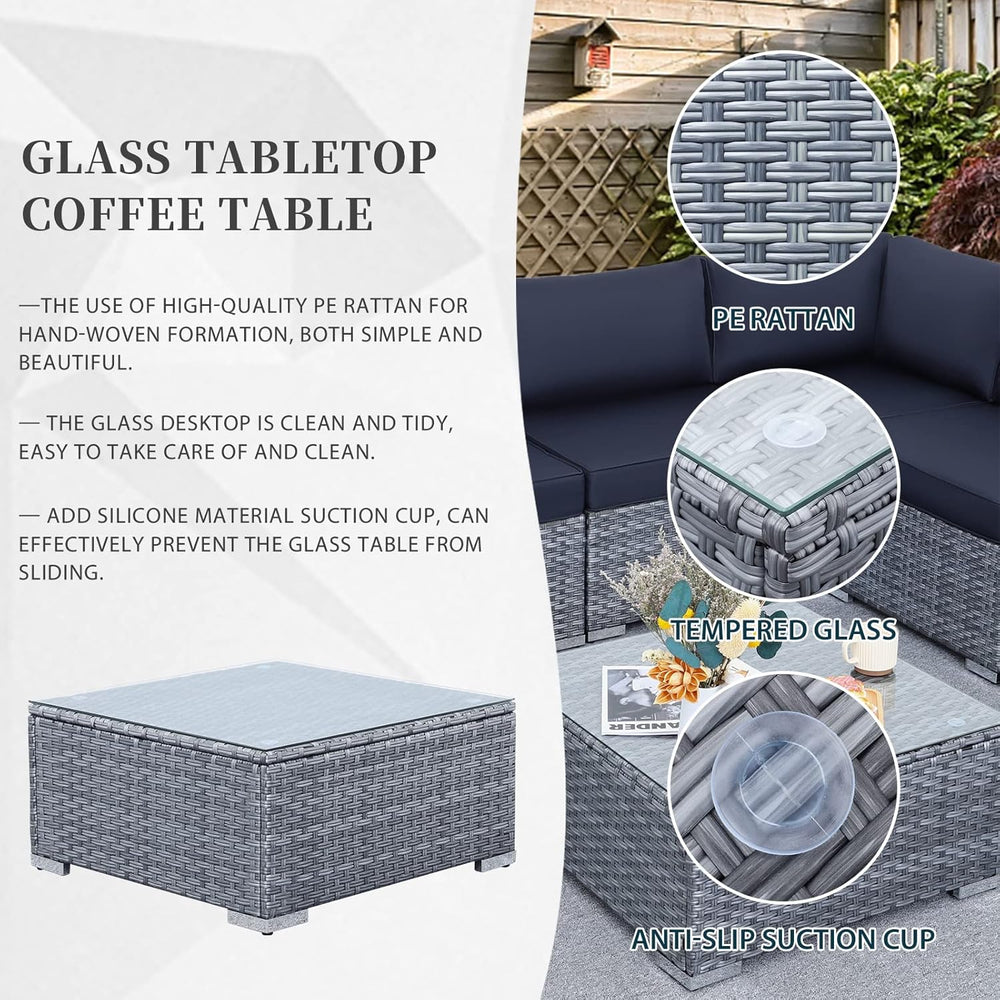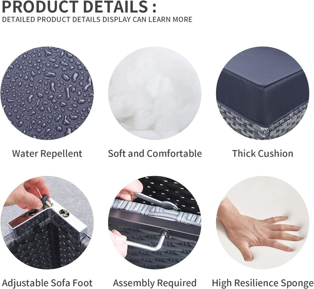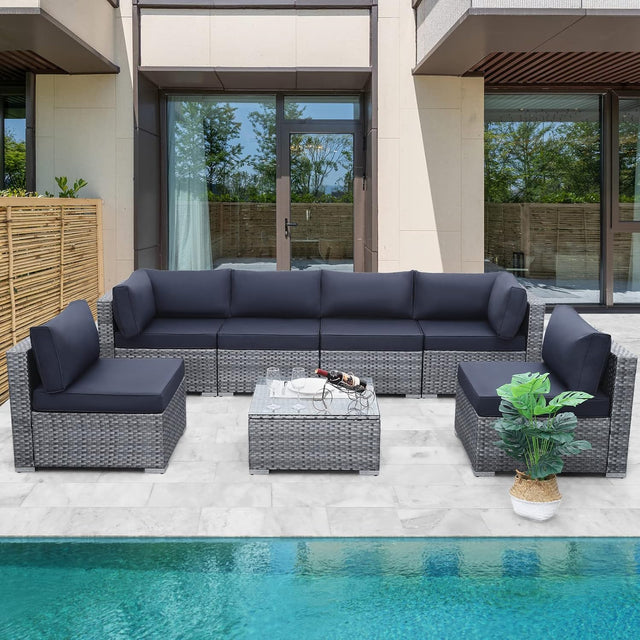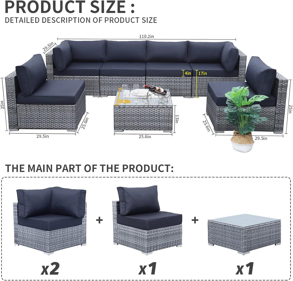 Valita Juego de muebles de mimbre PE para exteriores, 7 piezas, sofá seccional de ratán gris con cojines lavables azul oscuro