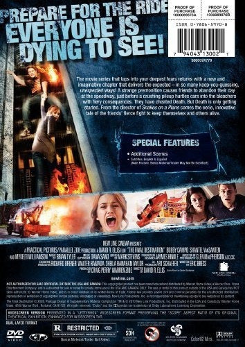 Caracterisiticas Nick y algunos amigos se dirigen al hipódromo durante el fin de semana para ver una carrera de autos. , cuando el terrible accidente vuela hacia la audiencia a 180 mph. Las personas salpicarán y serán destrozadas, una niña se golpeará la cabeza con un neumático volador, explosiones masivas y, finalmente, todo el estadio se derrumbará sobre el resto de la audiencia. Luego Nick descubre que era solo una visión que estaba por suceder, y él y otras 12 personas son expulsadas del estadio, pero Death regresa para acabar con los sobrevivientes, y los extraños accidentes son más brutales que nunca.