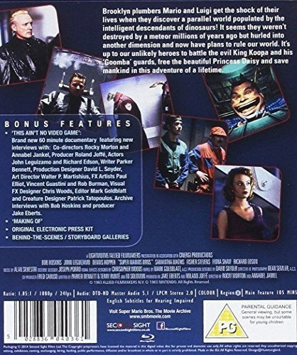 Rocky Morton y Annabel Jankel dirigen esta aventura familiar basada en los personajes de Super Mario Bros. Cuando Mario (Bob Hoskins) y Luigi (John Leguizamo), plomeros de Nueva York, son llamados para ayudar con una inundación en un sitio de excavación de dinosaurios por la bella Daisy (Samantha Mathis), se ven envueltos en una lucha paralela. universo reptil, gobernado por Koopa (Dennis Hopper), un líder que quiere fusionarlo con la Tierra.