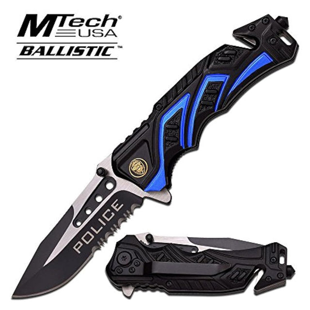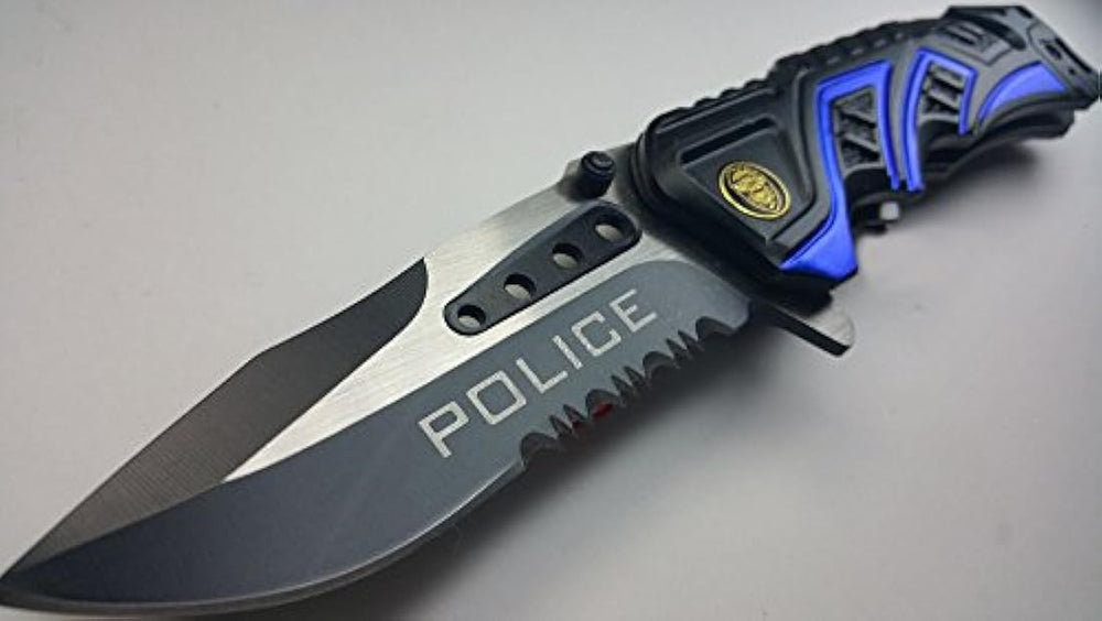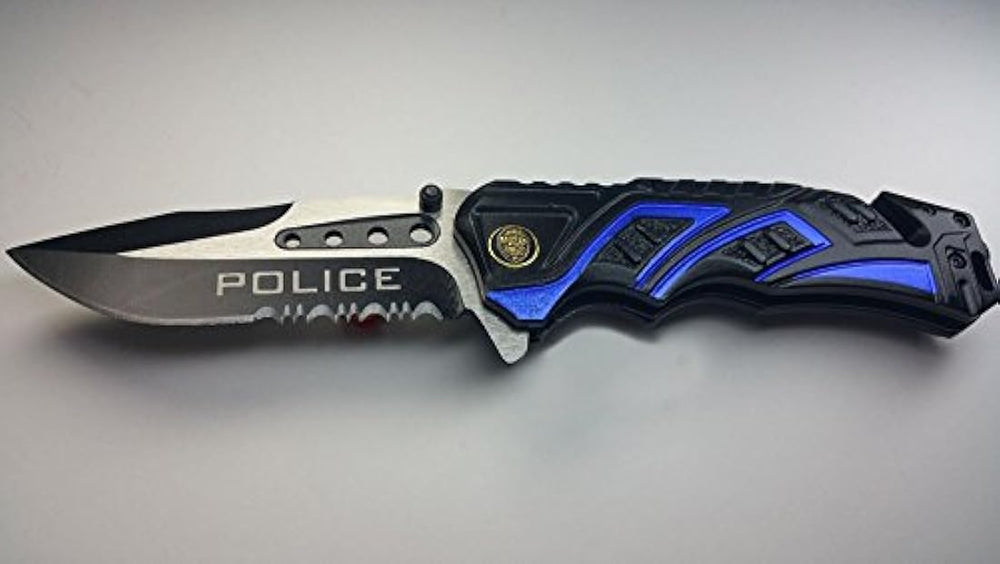*** Características *** Primavera asistida Cuchillo3.5 "hoja de acero inoxidable, 3 mm de grosor 2 tono específico hoja dentada con el pulgar Tachuelas8" general y 4.5 "cerrado Mango de aluminio anodizado negro y azul incluye clip para el bolsillo, cortador de cinturón de seguridad y Rompecristales