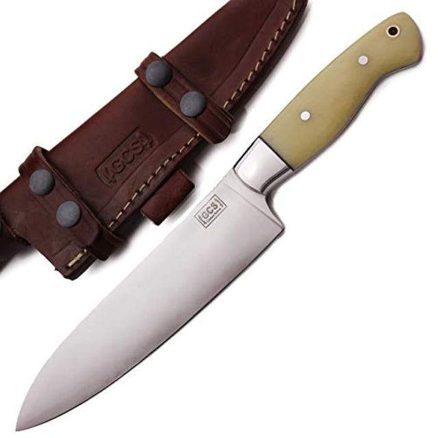 Mango de hueso. Espiga completa. Bordes muy afilados 59HRC endurecido al vacío - Pasadores de varilla de aluminio - Orificio para cordón de tubo de latón - Virolas de acero inoxidable altamente pulido ESPECIFICACIONES DEL CUCHILLO: 12.5 "en total, hoja de 7", ancho de hoja de 1.5 ", grosor de hoja de 1/4", mango de 5.5 ". Funda de cuero hecha a mano de cuero de silla de montar de piel de búfalo.