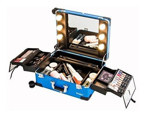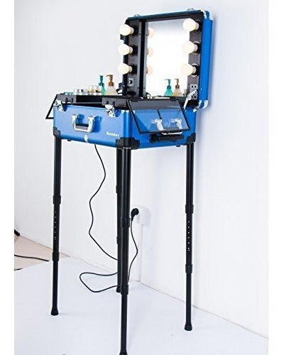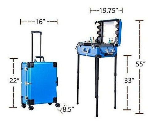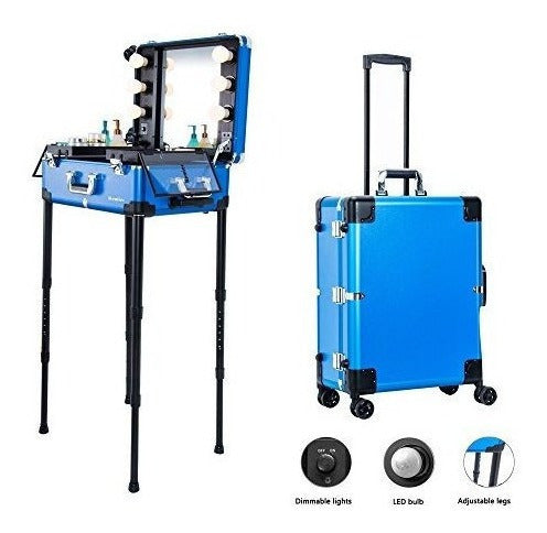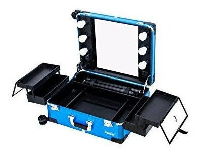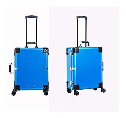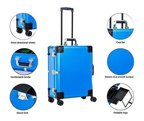 *** Características *** ? Acabado y construcción de aluminio de alta calidad con esquinas de acero reforzado para mayor durabilidad. ? Hermoso nuevo acabado liso azul con ribete de aluminio azul. ? El material exterior resistente al calor mantiene la funda fresca y protege sus cosméticos. ? Mango retráctil / telescópico para mayor durabilidad con ruedas para un fácil rodamiento. ? Mango resistente para mayor comodidad y agarre y sistema de cerradura y llave para mayor seguridad