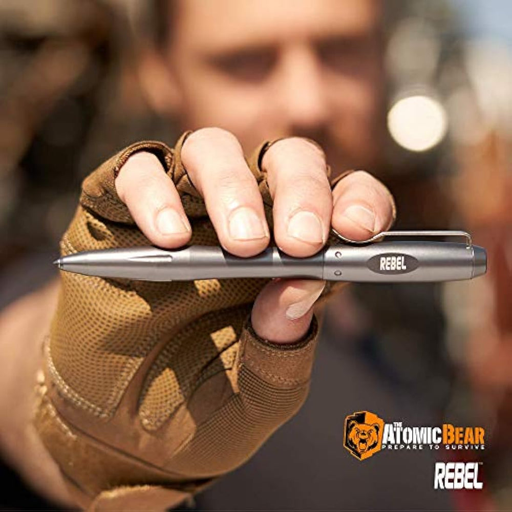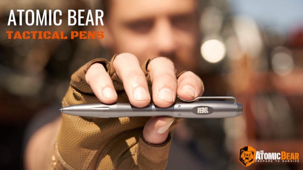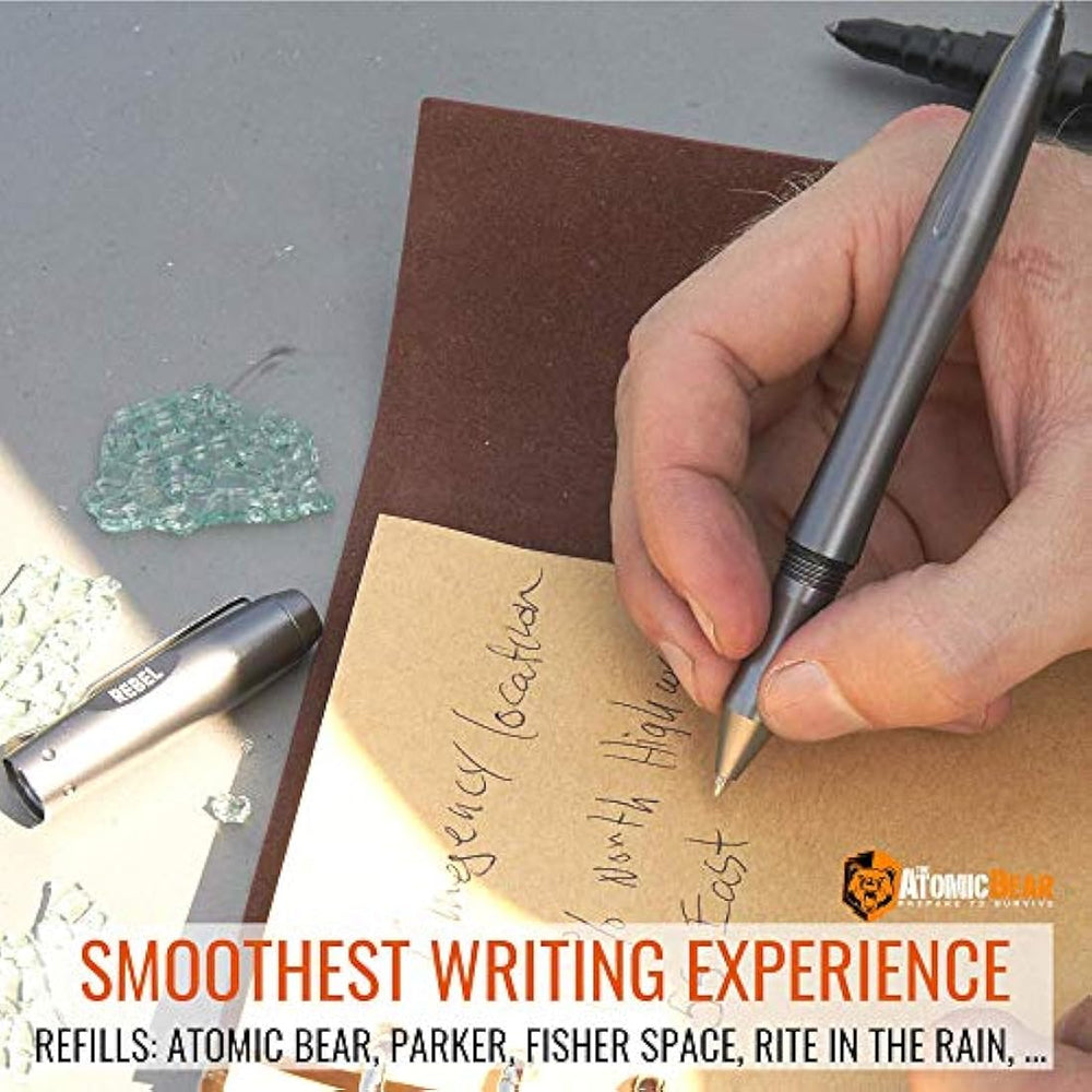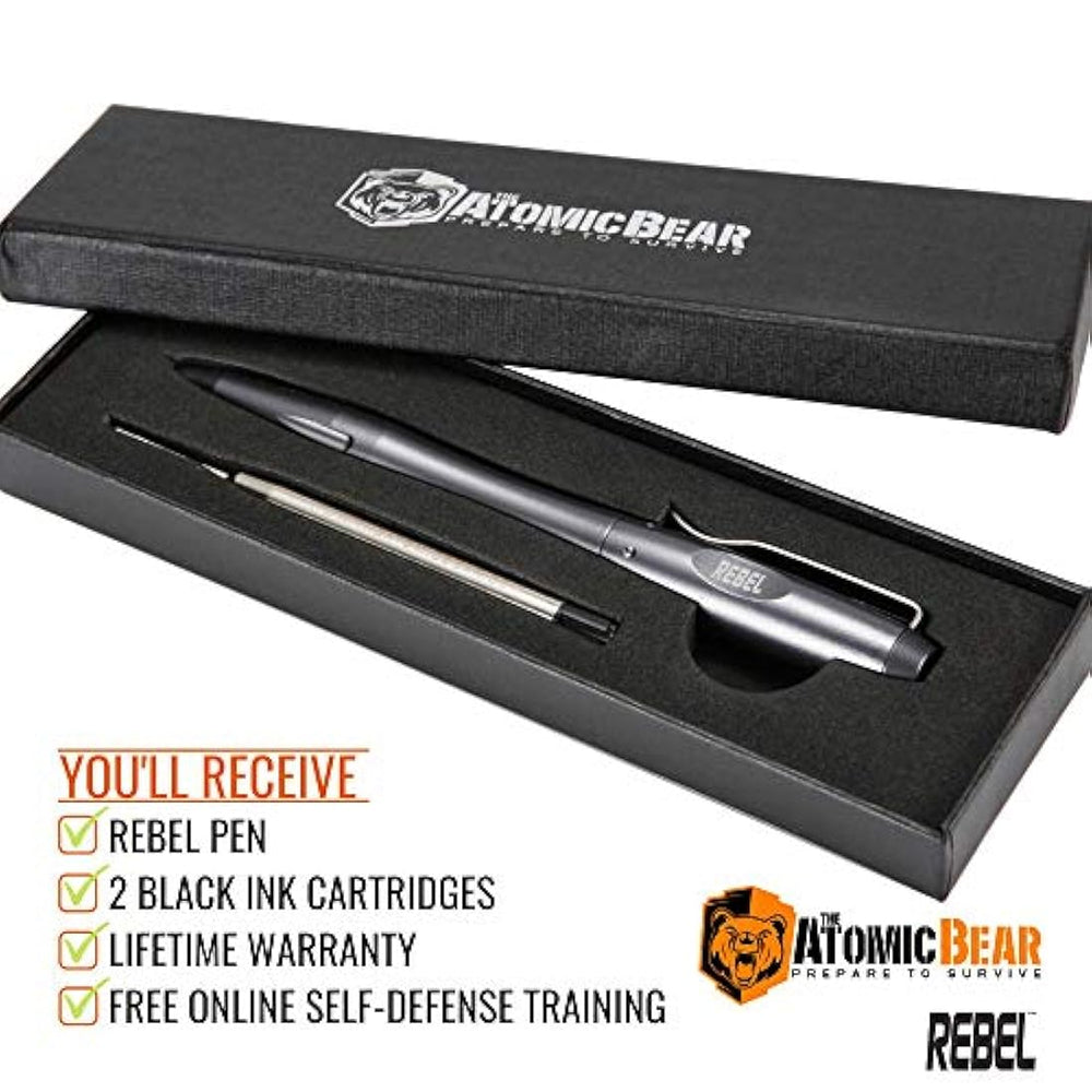 *** Características ***   . ARMA BADASS QUE VUELA BAJO EL RADAR - El lápiz táctico REBEL escribe de forma suave y uniforme y aparece inofensivo hasta su despliegue. Tiene una potente punta de romper cristal. Incluye 2 recambios grandes de tinta. Compatible con: recambios de tinta de oso atómico, parker, espacio de pescador, rito en la lluvia, etc. Hecho para el largo Haul - Viene con una . Se siente de alta calidad, equilibrado y lo suficientemente resistente para manejar lo inesperado. Con un resistente cuerpo de aluminio de grado militar mecanizado y una punta de cristal ultradura. No demasiado pesado. Gran agarre con reposamuñecas para máxima potencia de llamada. En caso de que el día haga vueltas - Agregado a su equipo táctico, este bolígrafo de autodefensa y el entrenamiento de video gratuito le dan la capa extra de seguridad que necesita en cualquier lugar donde vaya (reportado por muchos para pasar la seguridad TSA). ? ¿Por qué pró el oso atómico? Invirtimos constantemente en servirte con los productos que necesitas. Nuestros productos certificados sistemáticamente mejores calificaciones, número americapride, y se venden en todo el país. Te encantará todo sobre este bolígrafo. ¿Sólo en caso de que ofrece una de satisfacción sin riesgos? ? ¿Por qué todavía estás leyendo? Añadir a la cesta ahora porque te encantará este bolígrafo. El bolgrafo tctico REBEL es una herramienta seria. Utilice su punta de carburo de tungsteno para escapar del coche averiado, para salvar a un bebé de la carrera de calorías, o para defenderse contra un agresor.