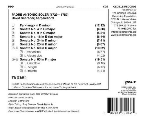 El teclista David Schrader, uno de los favoritos de la Orquesta Sinfónica de Chicago, hizo su debut discográfico en solitario con este CD de obras para clavecín del compositor español Padre Antonio Soler. Las composiciones de Soler adoptan melodías populares españolas, muestran afición por las síncopas y requieren virtuosismo del intérprete. El trabajo de Soler une los estilos barroco tardío y clásico temprano. "Como su ilustre predecesor en la corte española, Domenico Scarlatti", escribe David Schrader en sus notas del programa, "Soler también disfrutó del patrocinio de un miembro de la familia real ... Si bien la influencia de Scarlatti en Soler es evidente, es bueno nótense algunas diferencias destacadas en las obras para teclado de los dos compositores: Soler compuso más sonatas en un tempo relativamente moderado que Scarlatti; las acciaccaturas (notas disonantes que se tocan rápidamente entre tonos armónicos), tan propias del estilo de Scarlatti, rara vez aparecen en las obras de Soler; y Soler hizo un uso frecuente de los patrones de bajo de Alberti, que Scarlatti evitó. Las similitudes, sin embargo, incluyen la demanda de una técnica virtuosa, una afición por las síncopas y una completa infusión de la música folclórica española ". El instrumento utilizado en la grabación (un clavecín manual de dos metros y medio) fue construido por Paul Y. Irvin de Glenview, Illinois en 1989. Tiene un rango de cinco octavas, dos juegos de cuerdas al unísono y una parada pulida. Su diseño se inspiró en el diseño sonoro y acústico de un pequeño clavecín Giusti de 1681 ahora en el Museo Germanisches, Nürnberg. y Soler hizo un uso frecuente de los patrones de bajo de Alberti, que Scarlatti evitó. Las similitudes, sin embargo, incluyen la demanda de una técnica virtuosa, una afición por las síncopas y una infusión completa de la música folclórica española ". El instrumento utilizado en la grabación (un clavecín manual de dos metros y medio) fue construido por Paul Y. Irvin de Glenview, Illinois en 1989. Tiene un rango de cinco octavas, dos juegos de cuerdas al unísono y una parada pulida. Su diseño se inspiró en el diseño sonoro y acústico de un pequeño clavecín Giusti de 1681 ahora en el Museo Germanisches, Nürnberg. y Soler hizo un uso frecuente de los patrones de bajo de Alberti, que Scarlatti evitó. Las similitudes, sin embargo, incluyen la demanda de una técnica virtuosa, una afición por las síncopas y una infusión completa de la música folclórica española ". El instrumento utilizado en la grabación (un clavecín manual de dos metros y medio) fue construido por Paul Y. Irvin de Glenview, Illinois en 1989. Tiene un rango de cinco octavas, dos juegos de cuerdas al unísono y una parada pulida. Su diseño se inspiró en el diseño sonoro y acústico de un pequeño clavecín Giusti de 1681 ahora en el Museo Germanisches, Nürnberg. Irvin de Glenview, Illinois en 1989. Tiene un rango de cinco octavas, dos juegos de cuerdas al unísono y una parada de pulido. Su diseño se inspiró en el diseño sonoro y acústico de un pequeño clavicémbalo de Giusti de 1681 ahora en el Museo Germanisches, Nürnberg. Irvin de Glenview, Illinois en 1989. Tiene un rango de cinco octavas, dos juegos de cuerdas al unísono y una parada de pulido. Su diseño se inspiró en el diseño sonoro y acústico de un pequeño clavicémbalo de Giusti de 1681 ahora en el Museo Germanisches, Nürnberg.