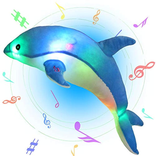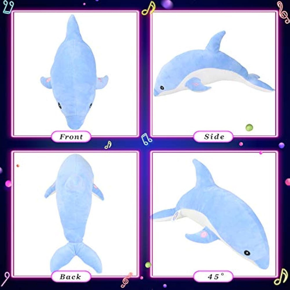 Un adorable delfín: el delfín relleno de LED mide aproximadamente 18.0 in de largo, que es un tamaño abrazable para abrazar y abrazar. El delfín es a menudo el símbolo del amor y romántico, por lo que puedes enviarlo a tus hijos, novias y otros seres queridos como regalos en Navidad, cumpleaños, día de los niños, día de San Valentín y otras ocasiones festivas, les encantará. Tocar música para ti: hay 8 canciones en el interior, todas son populares entre los niños y cantadas por voz clara. Pulsa el botón "?" en la aleta derecha del precioso delfín de felpa, la música se reproducirá, presiona de nuevo, se detendrá, de nuevo, changeá a otra canción. Tus hijos pueden aprender a cantar con él y se divertirán mucho.