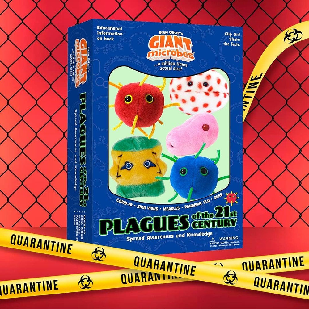 La mayor amenaza para el dominio continuo del ser humano en el pl a es el virus. - Joshua Lederb biólogo ganador del premio Nobel. También dijo: Vivimos en etición con microbios: bacterias y virus. No ha de que seremos los supervivientes. Este paquete de microbios desagradables que han causado estragos en los últimos tiempos te ayudará a difundir los hechos y darte cierta perspectiva. Difunde la conciencia y el conocimiento de estas plagas mortales y modernas. La caja de regalo temática de Plagues of the 21st Century incluye estos mini microbios: COVID virus del Z medi gripe pandemica y SARS.