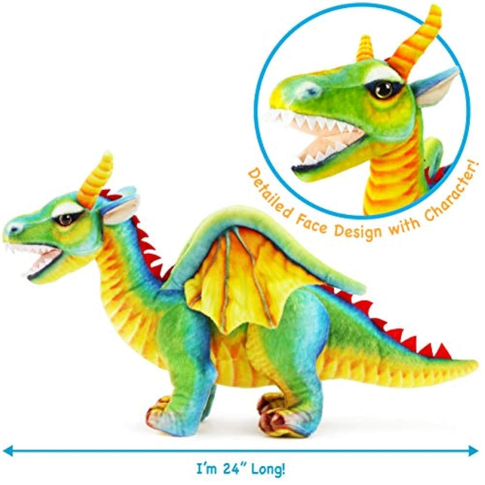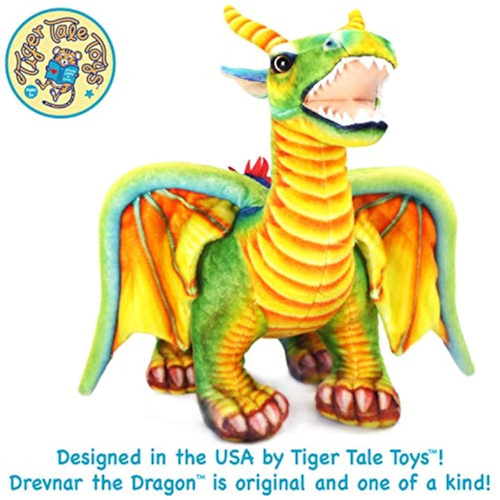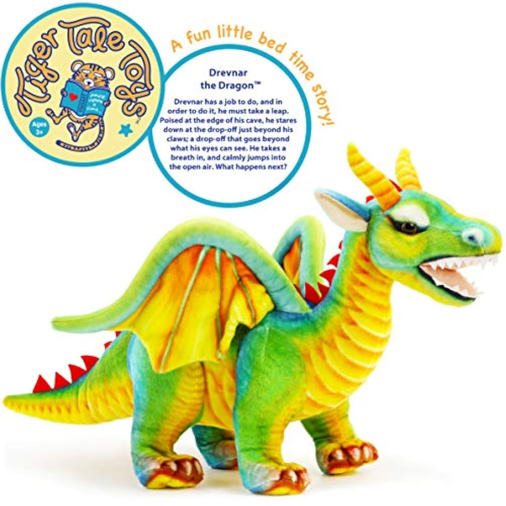 Tela de felpa suave; abrazable y muy bonito; viene con su propia historia. Este animal de peluche está cosido de forma segura con tejidos de poliéster de alta calidad y relleno de felpa de polipropileno blanco. Recomendado para mayores de 3 años; sin ftalatos, plomo, BPA o metales pesados; por favor, lavar a mano con jabón ligero y agua fría y dejar secar al aire. Tamaño y peso; Medidas del producto en 24.0 x 9.0 x 14.0 in; el producto pesa aproximadamente 11.9 lbs. Descripción del producto Drevnar el Dragón se enorgullece de sus escamas mágicas de colores brillantes, y le encanta compartir sus hermosos colores con el mundo. Desde su cueva en lo alto de las montañas, toma vuelo tras tormentas de lluvia para que el sol se refleje fuera de sus escalas, lanzando arco iris a través del cielo para que todos disfruten.