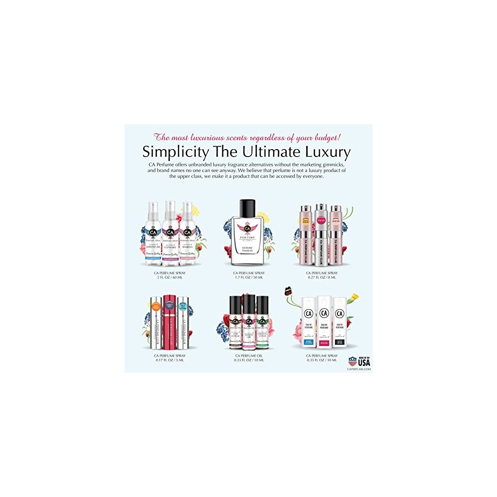 Perfil de fragancia: Aphrodisíaque de CA Perfume es una fragancia l afrutada para mujeres que se lanzó en 2017. Las notas superiores son pimienta bla mora y jazmín; las notas medias son miel de langosta ne orquídea de vainilla y cereo floreciente nocturno; las notas base son resinas y almizcle. Calidad fabricada en los Estados Unidos: nuestro perfume de grado premium está altamente concentrado y desarrollado por expertos por uno de nuestros maestros perfumistas aquí en los Estados Unidos. CA Perfume ofrece una forma inteligente y rentable de probar y descubrir tu próximo mejor perfume +600 gamas de perfumes de alta calidad con +30 nuevos tipos de perfumes añadidos regularmente cada mes para satisfacer todas las expectativas y llevar solo fragancias de alta calidad que tienen la misma calidad de perfume y longevidad que la costosa de diseñador. Precio asequible: di adiós al perfume de lujo c ra el perfume CA elimina el "impuesto de " en la fragancia que te gusta. Nadie puede ver la de perfume que llevas. En lugar de rar costosos perfumes de dis ra CA Perfume. Nunca te arrepentirás Siéntete bien. Paga menos. Crea tu armario de perfumes: cada ocasión requiere diferentes perfumes. Si estás harto de usar el mismo perfume para cada ocasión y quieres crear tu armario de perf estás en el lugar correcto. CA Perfume te ofrece empezar a construir tu armario de perfume de una manera muy asequible. Nuestras botellas son ligeras aprobadas por aviones para equipaje de mano. Lleva tu perfume favorito a cualquier lugar y úsalo para refrescarte en cualquier ocasión.