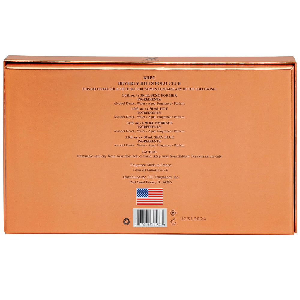 About this item Premium Quality: Experience excellence with our premium fragrances. Infused with natural essential oils and top-quality ingredie these scents linger all day with just a h a testament to their exceptional quality and longevity. Accessible Luxury: Indulge in opulence without breaking the bank! Our exclusive Beverly Hills Polo Club fragrances provide an affordable lux delivering a lavish experience that outshines overpriced petitors. Discover actual value in every captivating scent. Diverse Variety: Discover a fragrance that plements your individuality! Explore our exclusive collection of unique fragrances and body products to tailor your aroma to your personality. Established Appeal: Immerse yourself in the enduring charm of our fragran consistently hailed as best-sellers over time. With a track record that speaks volu these scents enhance confidence and create a lasting and unforgettable impression. Refined Design: Our fragrances exude sophistication with sleek glass bottles and stylish packaging. The simple yet bold design adds a touch of glamour to your fragrance collect making it a standout for anyone who appreciates refined aesthetics. Perfect Gift: More than just a fragra i a perfect gift for any occasion. Whether i a birth holi or just a kind gest make a lasting impression by gifting the allure of this iconic sc a thoughtful and memorable choice for those you care about. ¡Presentamos el Set de Regalo de 4 Piezas de Perfume para Mujer de Beverly Hills Polo C una colección exquisita que encarna la esencia del atractivo femenino y la sofisticación! Este set es una celebración de fragancias diversas y cautivado cada una representando un aspecto único de la femini ¡lo que lo convierte en el regalo perfecto para la mujer moderna que se deleita en expresar su individualidad y encanto! Sexy: El Eau de Parfum "Sexy" es una fragancia sensual y seduct diseñada para la mujer que irradia confianza y atractivo. ¡Con su cautivadora mezcla de notas les y cáli esta fragancia crea un aura irresistible perfecta para noches románticas o ocasiones especiales donde hacer una impresión memorable es clave! Sexy Blue: "Sexy Blue" ofrece un giro refrescante y fre ideal para la mujer que transmite serenidad y postura. ¡Sus notas acuáticas y frescas evocan la tranquilidad del océ creando un perfil de fragancia sereno pero cautivador! ¡Es perfecto para llevar durante el día u ocasiones que requieren un encanto sutil pero inconfundible! Embrace: El Eau de Parfum "Embrace" es una fragancia cálida y reconforta perfecta para la mujer que valora la cercanía y el afecto. ¡Su armoniosa mezcla de notas acogedoras y dulces envuelve al usuario en una sensación de confort y tern haciéndolo ideal para usar a diario o en momentos que requieren un toque de cuidado! Hot: "Hot" es una fragancia audaz y pica adecuada para la mujer que ama destacar. ¡Este Eau de Parfum bina notas ardientes y exóti creando un aura dinámica y vibrante! ¡Es una fragancia perfecta para hacer una declaración poder ya sea en un evento glamoroso o en un entorno profesional! Cada Eau de Parfum de 1 oz en el Set de Regalo de 4 Piezas de Perfume para Mujer de Beverly Hills Polo Club ofrece una experiencia de fragancia única y hermosa. ¡Ya sea que se sienta au juguet cariñosa o ser hay una fragancia para binar con cada estado de ánimo y ocasión!