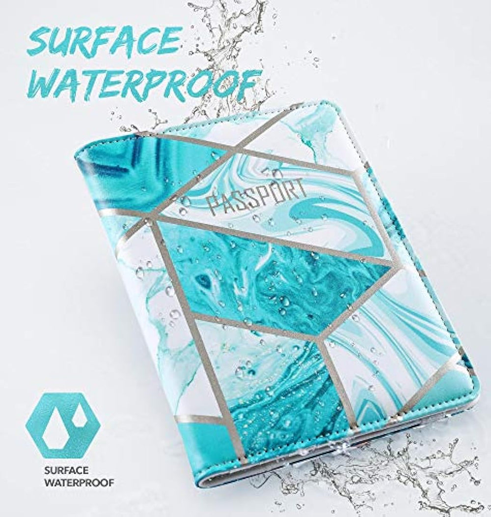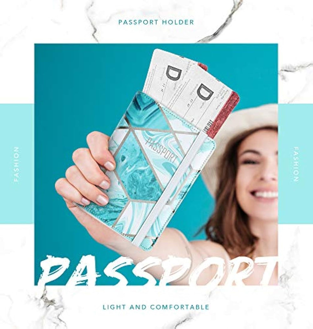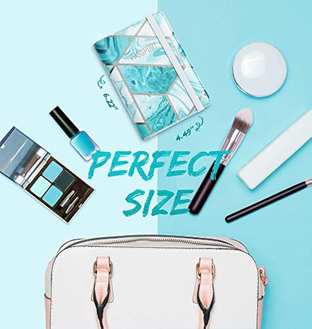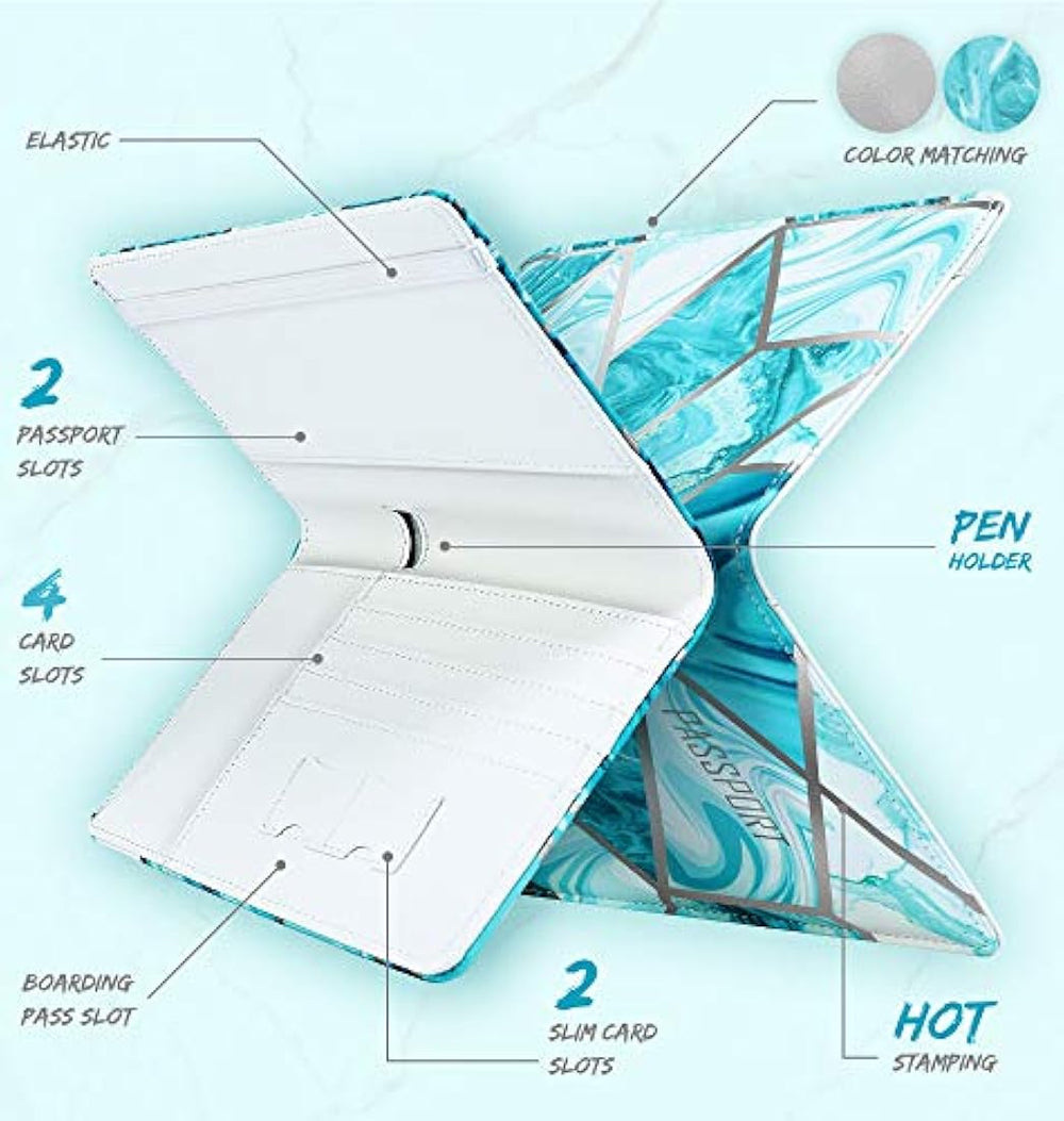 Características especiales Cierre Elástico, Ligero, Bloqueo Rfid, Impermeable Material Cuero Estilo Monedero RFID Gran capacidad: diseñado específicamente para guardar su pasaporte, tarjetas de crédito, identificación, licencia de conducir, boletos de viaje, efectivo y bolígrafo. Seguridad: el bloqueo RFID incorporado ayuda a evitar la divulgación de información de la cuenta personal y fomenta la seguridad. La banda elástica asegura que tus pertenencias permanezcan seguras. Alta calidad: Hecho de cuero suave sintético de primera calidad. Los materiales livianos no agregarán volumen ni peso al uso diario. Diseño elegante: funda para pasaporte de piel con estampado de mármol de larga duración. La superficie es resistente al agua y está hecha para soportar un uso intensivo.
