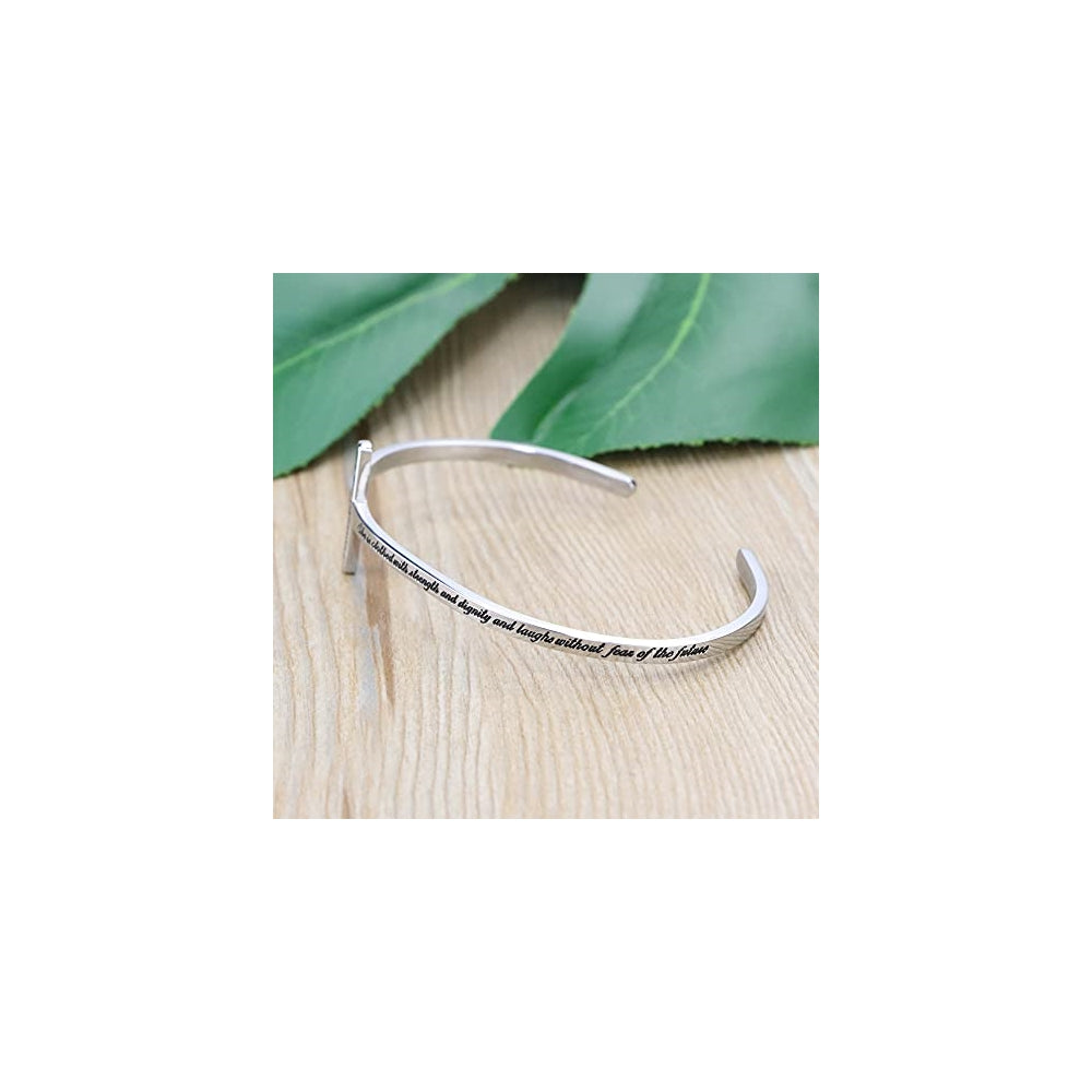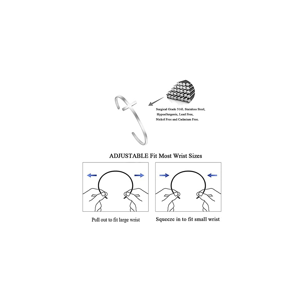 Brazalete de acero inoxidable cristiano con cruz y versiculo de la biblia Materiales: Acero inoxidable 316L, no se distorsiona, no se mancha, no se oxida, no sufre corrosión, con color y brillo de metal muy duraderos, sin materiales alérgicos. Tamaño ajustable: Diámetro de la pulsera: 2.5". Se puede ajustar para adaptarse a la mayoría de tamaños de muñeca.