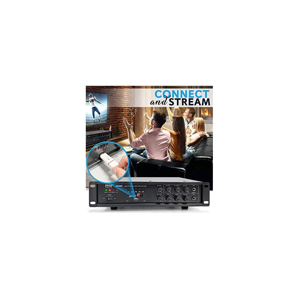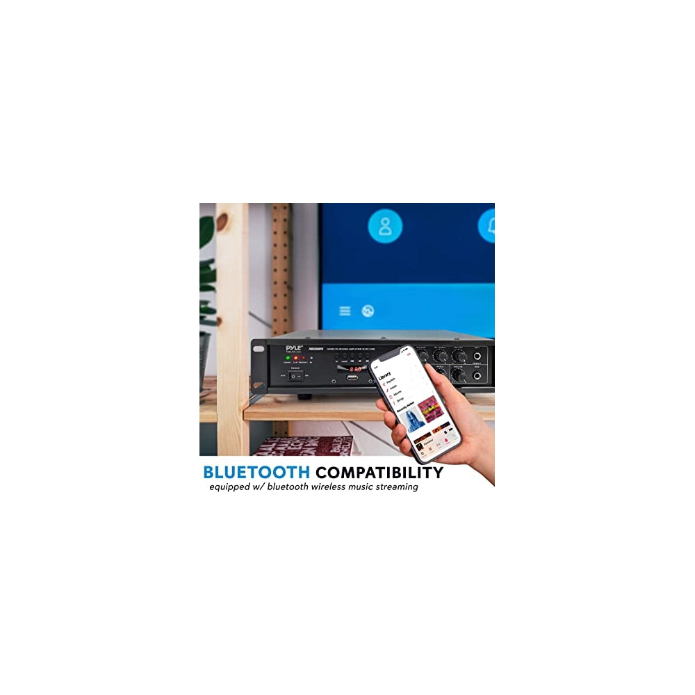 Potencia de 500 vatios: el amplificador de mezcla Pyle Home PA es perfecto para tu sistema de karaoke y entretenimiento en casa. Te da una potencia máxima de 500 W para ser utilizado para altavoces con impedancia de 4 ohmios que te permite disfrutar de audio amplificado de alta calidad 6 entradas: el amplificador mezclador digital de caja de amplificador soporta radio reproducción de audio MP3 y otros dispositivos externos. Está equipado con lecto entrada 2 entradas de micróf entradas de señal digital ópticas y coaxia entradas A salida de línea y salidas de 70 V 100 V Compatible con Bluetooth: el receptor estéreo integrado profesional para interiores está equipado con transmisión de música inalámbrica Bluetooth. Funciona con los últimos dispositivos de hoy e incluyendo smartpho table portátiles y utadoras con emparejamiento receptor sin licaciones Control de panel frontal: el dispositivo acto de amplificador de altavoz de sonido de cine en casa cuenta con controles de panel frontal con pantalla LED digi selección de entrada de audi centro de control giratorio para control de volumen de micróf agu gra eco y volumen maestro Montaje en rack: el receptor de audio profesional de cine en casa de alta potencia cuenta con un diseño universal de montaje en rack con antena de radio. Las características adicionales incluyen MIC 1 y 2 niveles de ganancia control de conversación y función de prioridad MIC 1. Incluye control remoto y antena FM