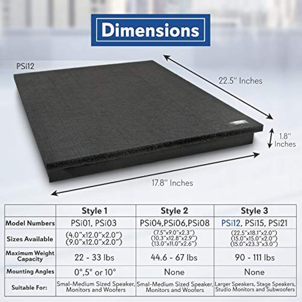 Crea un sonido óptimo: los elevadores de altavoces Pyle ayudan a lograr un rendimiento de audio óptimo. Reduce la vibración y ayuda a eliminar los niveles no deseados de resonancia de audio mientras promueve el flujo de proyección de sonido del altavoz "limpio" Compatibilidad universal: incluye 1 almohadilla de plataforma elevadora de amortiguación de sonido que es universalmente atible y funciona con prácticamente todos los tipos de altav s y modelos. Diseñado para monitores de estu subwoof altavoces altavoces de estante. Espuma gruesa y duradera: hecha de espuma de alta densidad diseñada que está probada en laboratorio para promover una estabilización eficiente del alta aislamiento de ruido y absorción de amortiguación de sonido que da a tus frecuencias de audio capacidad de flujo libre con claridad de graves más natural Almohadilla de base antideslizante: cuenta con una base de goma antideslizante que ayuda a mantener tus altavoces seguros y estables. También está equipado con una placa superior de acero grueso mecanizado CNC integrada para una colocación robusta de los altavoces. Perfecto para uso en escenario o estudio Capacidad de carga de 110 libras: cada elevador mide 22.5 x 17.8 x 1.8 pulgadas con capacidad máxima de peso del altavoz de hasta 110 libras. Construcción de espuma de alta densidad y atibilidad universal de altavoces que estabiliza y reduce eficazmente el retroceso para cualquier aplicación de audio