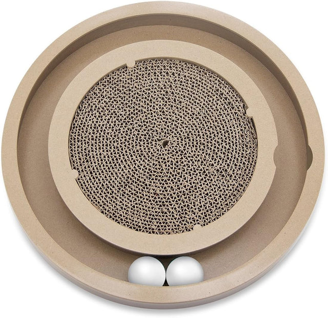 Rascador para gatos Spin and Chase: un juguete interactivo que mantiene a tu mascota persiguie rayando y jugando este exclusivo sistema Scratch & Spin cuenta con una almohadilla de cartón corrugado en el medio y dos bolas que pueden perseguir en la pista interior. Almohadilla de cartón reemplazable: nuestra tabla rascadora de doble cara para gatos se puede cambiar por otras almohadillas redondas para gatos para ga por lo que puedes apoyar el juego activo mucho después de que esta almohadilla se rompa para triturar. Perfecto para apoyar a gatitos y gatos de todas las edades. Dos bolas interactivas para gatos: dentro de la pista de nuestra almohadilla rascadora para gatos encontrarás dos bolas de rodamiento suave que a los gatos les encantará golp golpear hacia adelante y hacia at y perseg lo que es bueno para apoyar la salud diaria física y mental. Base antideslizante para mayor estabilidad: el rascador de almohadillas para gatos Best Pet Supplies está equipado con cuatro "pies" antideslizantes en la parte inferior que ayudan a evitar que se deslice alrededor de mad azule linóleo o alfom por lo que los gatos pueden golp ra saltar y deslizar de forma segura. Diseño duradero y contemporáneo: un pequeño diámetro de 10.25 pulgadas significa que puedes mantener fácilmente este juguete para gatos en la esquina de tu sala de estar o justo en el medio de la habitac mientras que la madera rústica y naturalmente reciclada se adapta perfectamente a otras decoraciones del hogar.