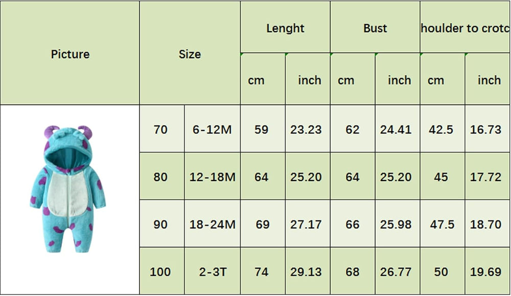 Mono de invierno de forro polar para bebés con capucha de cuerno de animal de dibujos anima cálido y gru ideal para niñas y niños. Tallas: 70 Longitud: 59 cm Busto: 62 cm Edad r endada: 6-12 meses 80 Longitud: 64 cm Busto: 64 cm Edad r endada: 12-18 meses 90 Longitud: 69 cm Busto: 66 cm Edad r endada: 18-24 meses 100 Longitud: 74 cm Busto: 68 cm Edad r endada: 2-3 años 110 Longitud: 79 cm Busto: 70 cm Edad r endada: 3-4 años 120 Longitud: 84 cm Busto: 72 cm Edad r endada: 4-5 años Especificaciones: Nombre: Mono de invierno de forro polar para bebés Género: Niñas Niños Material: 100 poliéster Patrón: Dibujos animados de animales de ganado Contenido del paquete: 1x Mono de invierno Consejos amigables: 1. Por fa permita una diferencia del 2-3 según la medición manual. 2. Verifique cuidadosamente la tabla de medidas antes de prar el artí . (1 pulgada = 2.54 cm) 3. Tenga en cuenta que una ligera diferencia de color debería ser aceptable debido a la luz y la pantalla. ¡Gracias!