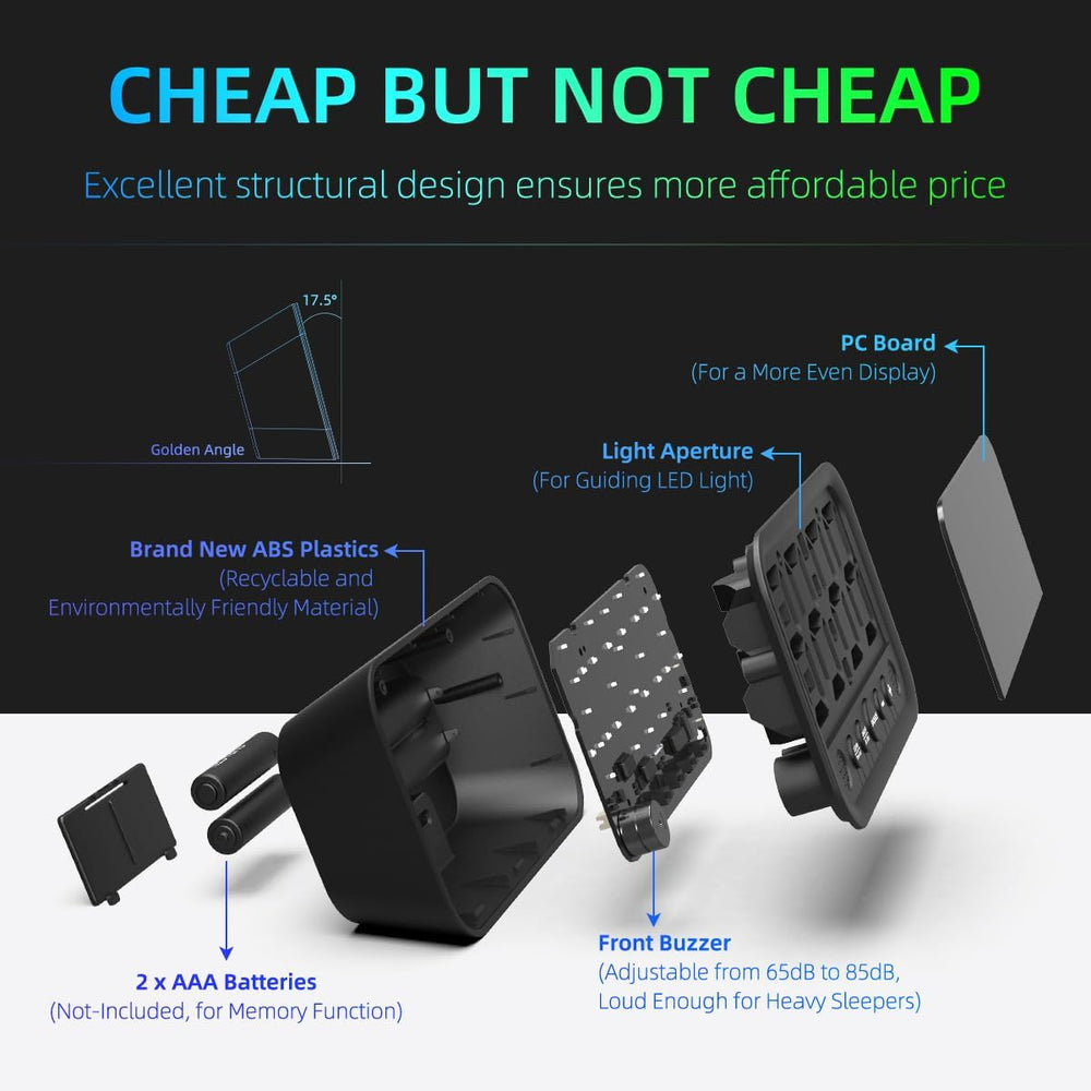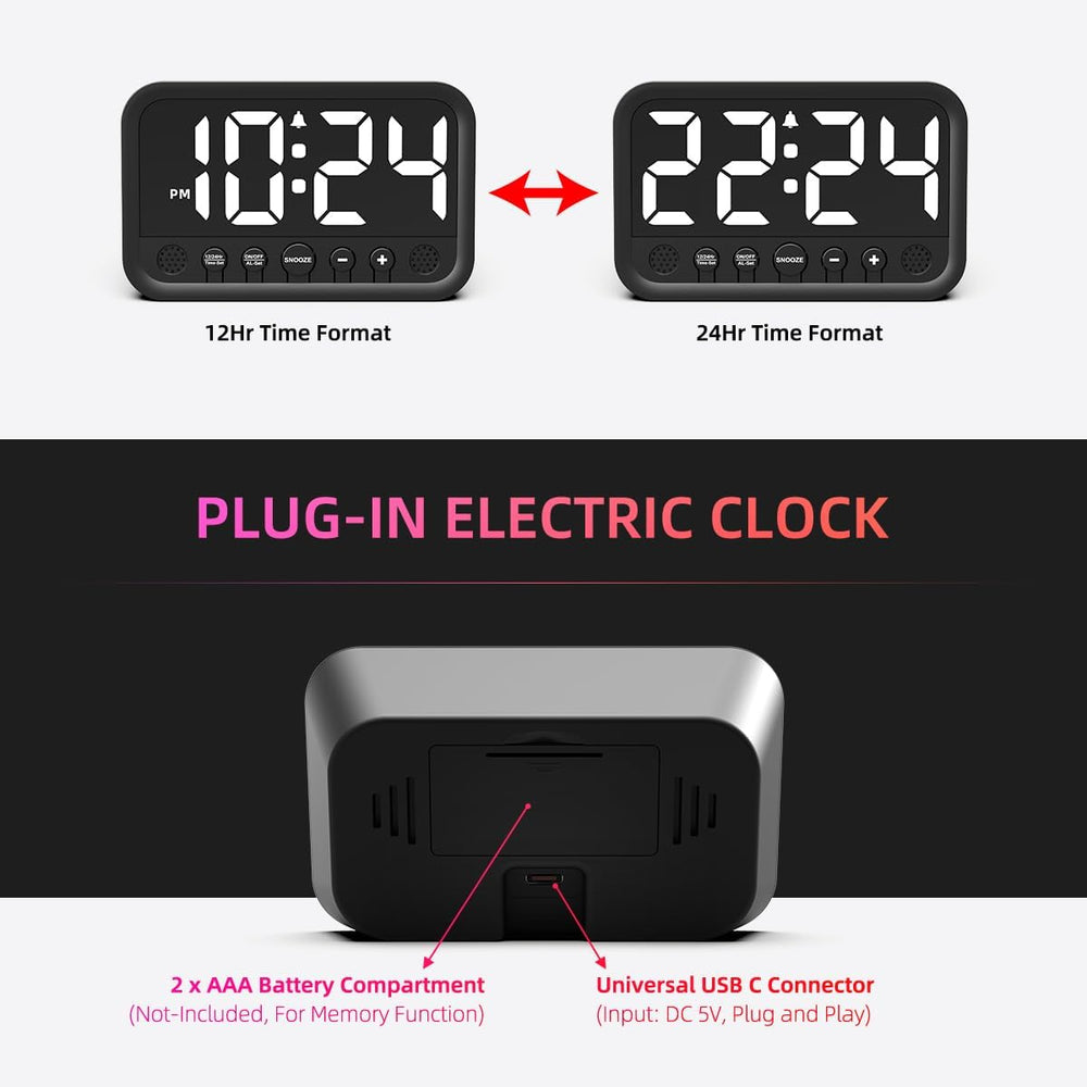 About this item SMALL DIGITAL CLOCK WITH DIMMABLE LED DISPLAY – The small clock is incredibly fantas featuring an ultra-clear display with 6 levels of brightness and time digits that stand at a height of 1.5 inches. I the great bedroom clock for your beds desk or nightstand. LOUD ALARM CLOCK WITH 5-LEVEL BUZZER VOLUME - The users of our loud alarm clock can easily set their preferred alarm volume (ranging from 65 to 85 dB) to wake up in a gen natu or even more energetic manner. PLUG-IN ELECTRIC CLOCK WITH MEMORY FUNCTION – The electric alarm clock features a widely used USB C connector for universal patibil and the 2xAAA battery-backup function ensures that time and settings are preserved in case of a power outage. SIMPLE ALARM CLOCK - All the buttons are located on the fr along with the simplified functional setti makes this simple clock extremely easy t which is user-friendly for seniors and kids. BASIC ALARM CLOCK – Features a switchable 12 24-hour time format and an adjustable snooze time ranging from 1 to 15 minutes. ? See more product details Información del producto Medidas - Peso del artí : 3.52 onzas - Dimensiones del art (An x Al): 4.7" An x 3" Al Detalles del artí - UPC: 756166536616 - Opiniones d s: 4.5 de 5 estrel 309 valoraciones D8PGGNYY - Ranking de los más vendidos number 27,311 en Hogar y Cocina (Consulta los 100 más vendidos en Hogar y Cocina) - Número de artí s: 1 - Fabricante: XUANZIT : XUANZIT Características y especificaciones - Tipo de montaje: Sobremesa - Movimiento del reloj: Cuarzo - Modo de operación: Eléctr Mecánico - Reloj despertador: Sí - Fuente de alimentación: USB-C - Uso en interiores y exteriores: Solo en interiores - Pilas incluidas: No - Tipo de pantalla: LED - Funciones especiales: Reloj digital pequeño con pantalla LED regula Reloj eléctrico enchufable con función de memo Reloj despertador sencillo con ajustes funcionales simplifica Reloj despertador ruidoso con volumen de zumbador de 5 niveles del producto: Para obtener información sobre l de este produ ha Comparte: - Reloj digital LED pequeño para dormito reloj despertador ruidoso para adultos con sueño pes adolescente Reloj de escritorio enchufable eléctric Reloj sencillo para mesita de noche con volumen brillo snooze ajustables - Blanco ¿Te gustaría contarnos sobre un precio más bajo? ¡Haznos saber! Aunque no podemos igualar todos los precios reporta utilizaremos tus entarios para asegurarnos de que nuestros precios sigan siendo petitivos.