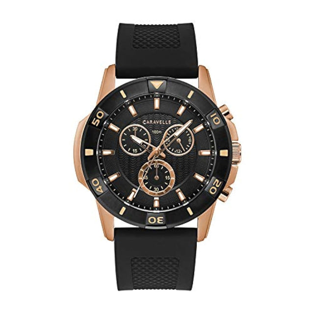*** Características *** Cristal mineral. Silicona Forma y función, no se necesita compromiso. Caja de acero inoxidable en dos tonos dorado rosa con bisel negro giratorio unidireccional. Textura de esfera inspirada en ola negra con agujas y marcadores luminosos. Movimiento cronógrafo de seis manecillas. Correa de silicona negra con cierre de hebilla tang de tono oro rosa. Diámetro de la caja: 48 mm espesor de la caja: 11. 8 mm resistencia al agua: 100 m
