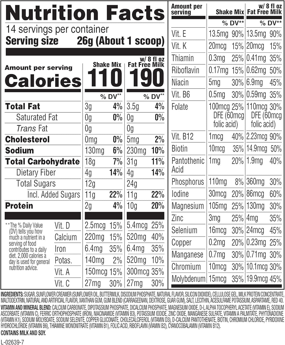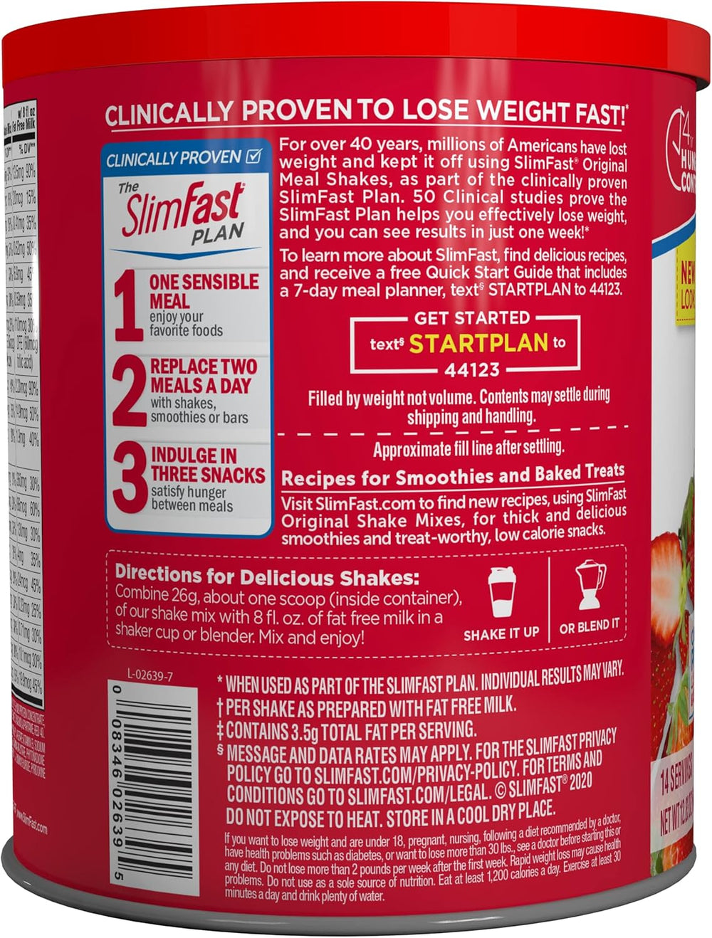 SlimFast Sabor Fresa Peso del artículo 2 Libras Proteína 2 Gramos Vitaminas y minerales 45, 5, 140 Porcentaje de la cantidad diaria Sobre este artículo Sabor a fresas y cr los s SlimFast Origina de da Shake Mix son una deliciosa manera de perder peso Repleto de proteí vitaminas y minera el SlimFast Original d de da es una fórmula equilibrada llena de 24 vitaminas y minerales esenciales Los s SlimFast Original Shake Mix son un producto excepcional d de da que reduce el hambre hasta cuatro horas para mantenerte satisfecho Apoyo digest los s originales SlimFast contienen 0.14 oz de fibra para ayudar a promover una mejor digestión y no contienen gluten *No es un alimento bajo en calorías. Consulta los datos nutricionales para ver el contenido de grasa saturada.