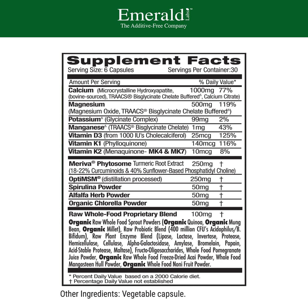 Apoyo para huesos fuertes: cuando el calcio y el magnesio se absorben correctamente del torrente sanguíneo, se puede utilizar para ayudar a construir la densidad ósea. Tomar suplementos de salud ósea como calcio, magnesio y vitamina K2 puede ayudar a las personas que tienen huesos delgados y débiles a construir huesos más fuertes. Óptimo apoyo para la salud ósea: nuestros cuerpos requieren calcio para hacer varias tareas importantes, incluyendo ayudar a coágulos de sangre correctamente, apoyar la salud nerviosa y muscular. El calcio también es importante cuando se trata de la salud de los huesos y los dientes. Apoyo para la salud cardiovascular: suplementos saludables para el corazón que facilitan la correcta absorción de calcio en las arterias. Nuestra mezcla única para la salud ósea ayuda al cuerpo a utilizar calcio para inhibir los depósitos de calcio en las arterias para un efecto protector y saludable para el corazón. Ingredientes naturales: suplemento dietético garantizado para estar libre de maíz, leche, soja, sal, azúcar, trigo, levadura, sabores artificiales o conservantes. Fórmula a base de alimentos crudos con probióticos y enzimas. La misión de los laboratorios de esmeralda: los laboratorios de esmeralda se comprometen a crear solo productos limpios y sin aditivos