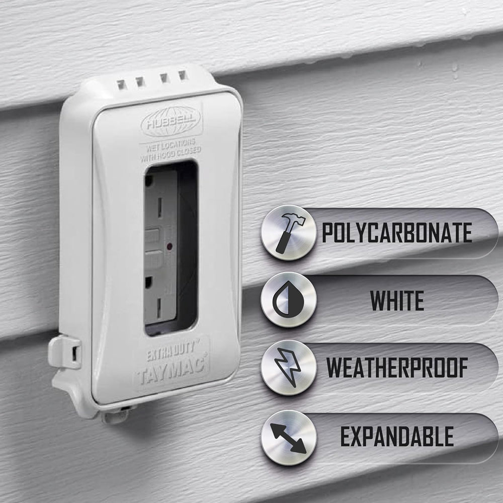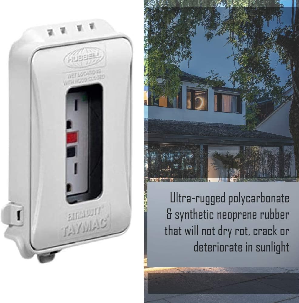 Tipo de interruptor Palanca Material Policarbonato TayMac Color Blanco Dimensiones del producto 3,61"an. x 5,73"al. pulgadas Sobre este artículo Clasificación extra resistente: obtén la máxima dureza y protección. Nuestra cubierta de salida eléctrica expandible de 1 banda resistente a la intemperie para mejoras del hogar está clasificada extra resistente y lista UL para lugares húmedos y húmedos. Fácil de instalar: configura tu cubierta de salida al aire libre en poco tiempo. Nuestro sistema de montaje de ojo de cerradura de ajuste rápido permite la instalación en menos de un minuto con un pin de cambio EZ para montaje horizontal o vertical. 16 configuraciones personalizadas: nuestra cubierta de salida resistente a la intemperie utiliza UFAST para configuraciones de dispositivos personalizados 16 en 1. Puedes montar y proteger dúp interruptor o GFCI. Construcción de calidad: nuestra cubierta de enchufe para salidas está construida con policarbonato de alto impacto para una máxima durabilidad y goma de neopreno sintético que no se pu agrieta o deteriora con la luz solar.