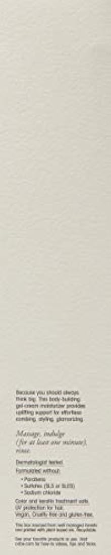 Porque siempre debes pensar en grande. Esta crema hidratante de gel-crema para la construcción del cuerpo proporciona un soporte edificante para un peinado, peinado y glamour sin esfuerzo. Tratamiento de color y queratina seguro. Protección UV para el cabello. Vegano, sin crueldad y sin gluten.