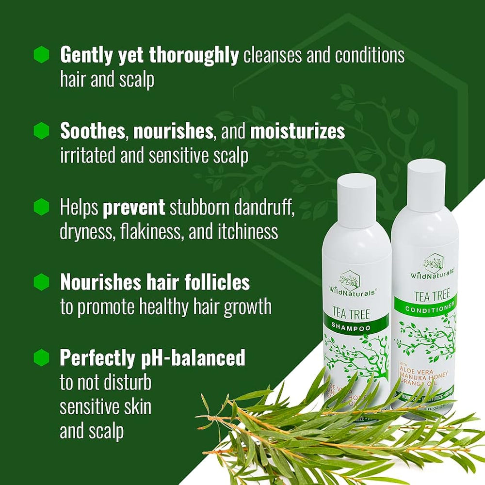 Beneficios del producto Nuestro suave champú y acondicionador con aceite de árbol de té está formulado para revitalizar tu cabello y cuero cabelludo mientras lo hidrata con miel de man aceite de naranja y aloe verNuestro suave champú y acondicionador con aceite de árbol de té está formulado para revitalizar tu cabello y cuero cabelludo mientras lo hidrata con miel de man aceite de naranja y alo… Material libre de Sin Parabenos Forma del producto Líquido Wild Naturals Tipo de cabello Seco Lim acondiciona y nutre: este champú y acondicionador orgánico limpia y acondiciona suavemente tu cabello y cuero cabelludo sin quitar los aceites naturales. Nuestro juego de champú y acondicionador natural proporciona todos los nutrientes esenciales que tu cabello y cuero cabelludo necesi haciéndolos fuer equilibrados y saludables. Ca hidrata e hidrata: nuestro champú y acondicionador para la caspa p ra profundamente en la piel para proporcionar un alivio calmante y enriquecido en nutrientes de la picazón y las molestias. Este champú y acondicionador para el cabello está repleto de vitaminas y minerales para hidratar e hidratar tu cabello y cuero cabell evitando la ca la sequedad y la descamación. Cabello más gru más abundante y saludable: este champú y acondicionador hidratante estimula el crecimiento saludable del cabello para promover un cabello más grueso y lleno. Nuestro champú y acondicionador clarificantes proporcionan una nutrición profunda a los folículos pilo haciéndolos gruesos y fuertes. Tea Tree actúa un potente promotor del crecimiento del cabe impulsando el ciclo de crecimiento natural del cabello. Con ingredientes naturales y orgánicos: impregnado con algunos de los ingredientes más potentes de la natural nuestro mejor champú y acondicionador nutre tu cabello desde la raíz hasta las puntas. Este juego de champú y acondicionador para hombres y mujeres está hecho con aceite de árbol de miel de man aloe vera y más para equilib rejuvenecer y restaurar tu cabello y cuero cabelludo. Seguro y perfectamente equilibrado con pH: nuestro champú y acondicionador sin sulfato también están libres de parabenos y otros productos químicos nocivos. Con nuestro champú y acondicionador sin sulfato ni parabenos hipoalergénico y libre de cruel puedes estar seguro de que estás utilizando un producto que no solo es amable con tu cabe sino también con el medio ambiente.
