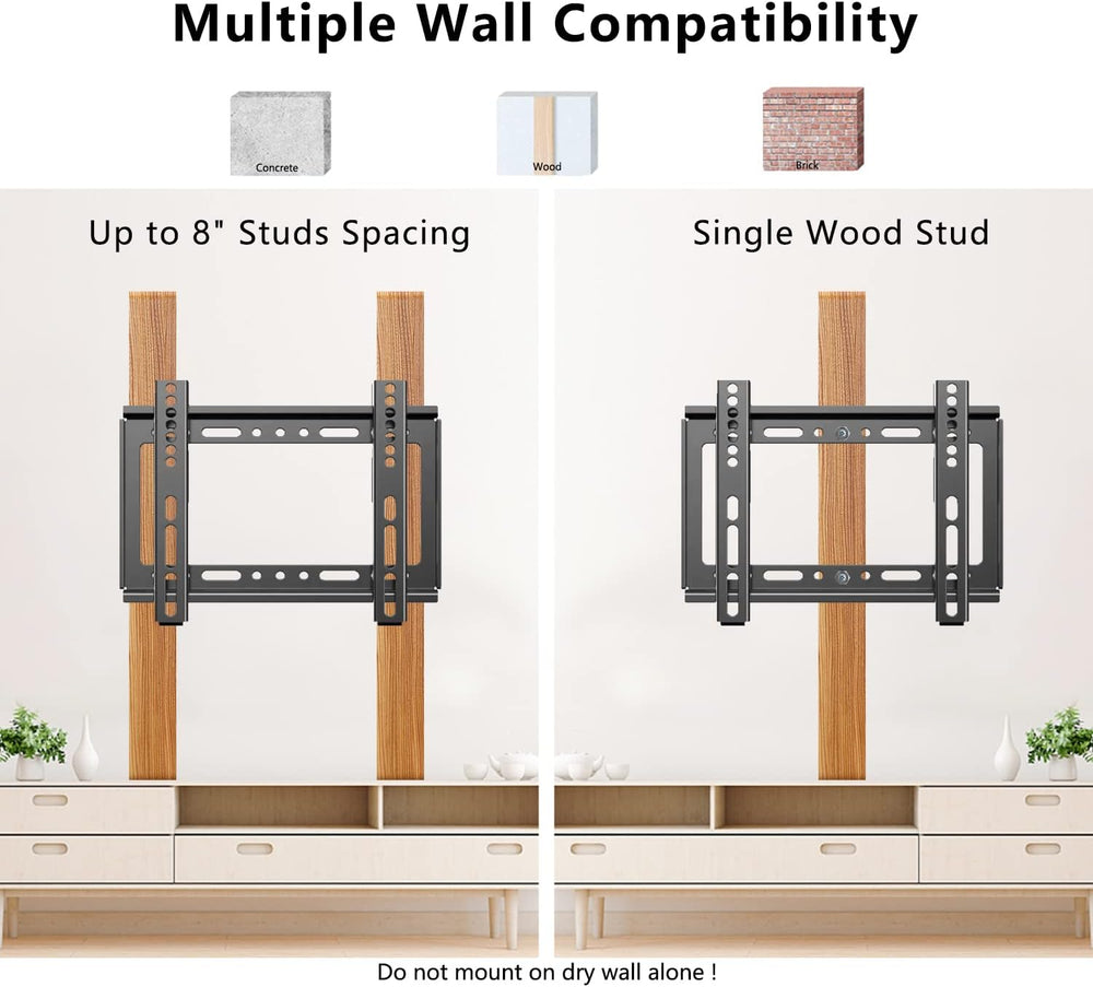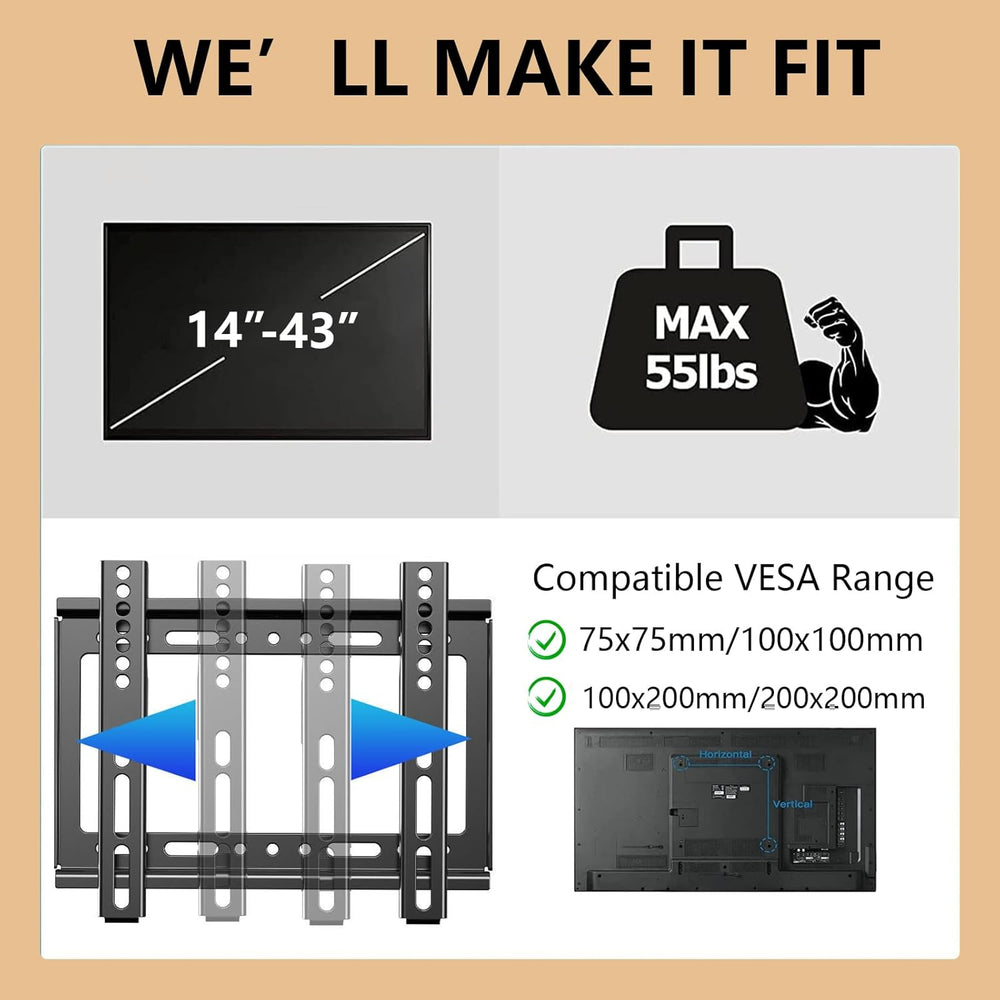 Descripción del producto: de pared para TV universal: se adapta a la mayoría de los televisore o curvos LCD LED OLED de 14" soporta hasta 55 lib con espacio de montaje VESA máximo de 200x200 200x100 100x100 100x200 75x75 ideal para la mayoría de los televisores o monitores. Diseño delgado y elegante: diseño de perfil bajo que mantiene su televisor a solo 0.9" de la pa para un aspecto moderno. Construcción segura: fabricado con materiales de acero premium y acabad con tecnología de soldadura avanzada par estabilidad y seguridad. Fácil instalación en 15 minutos: diseño simple e intuitivo que hace que la instalación sea rápida y sencilla. ¡Deje que mejore su vida de ocio: úselo de monitor de TV para liberar espacio en el escritorio y mejorar su postura. ¡Est de TV es muy útil en la vida diaria!