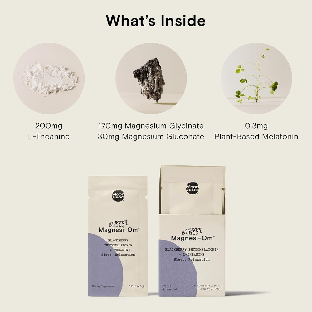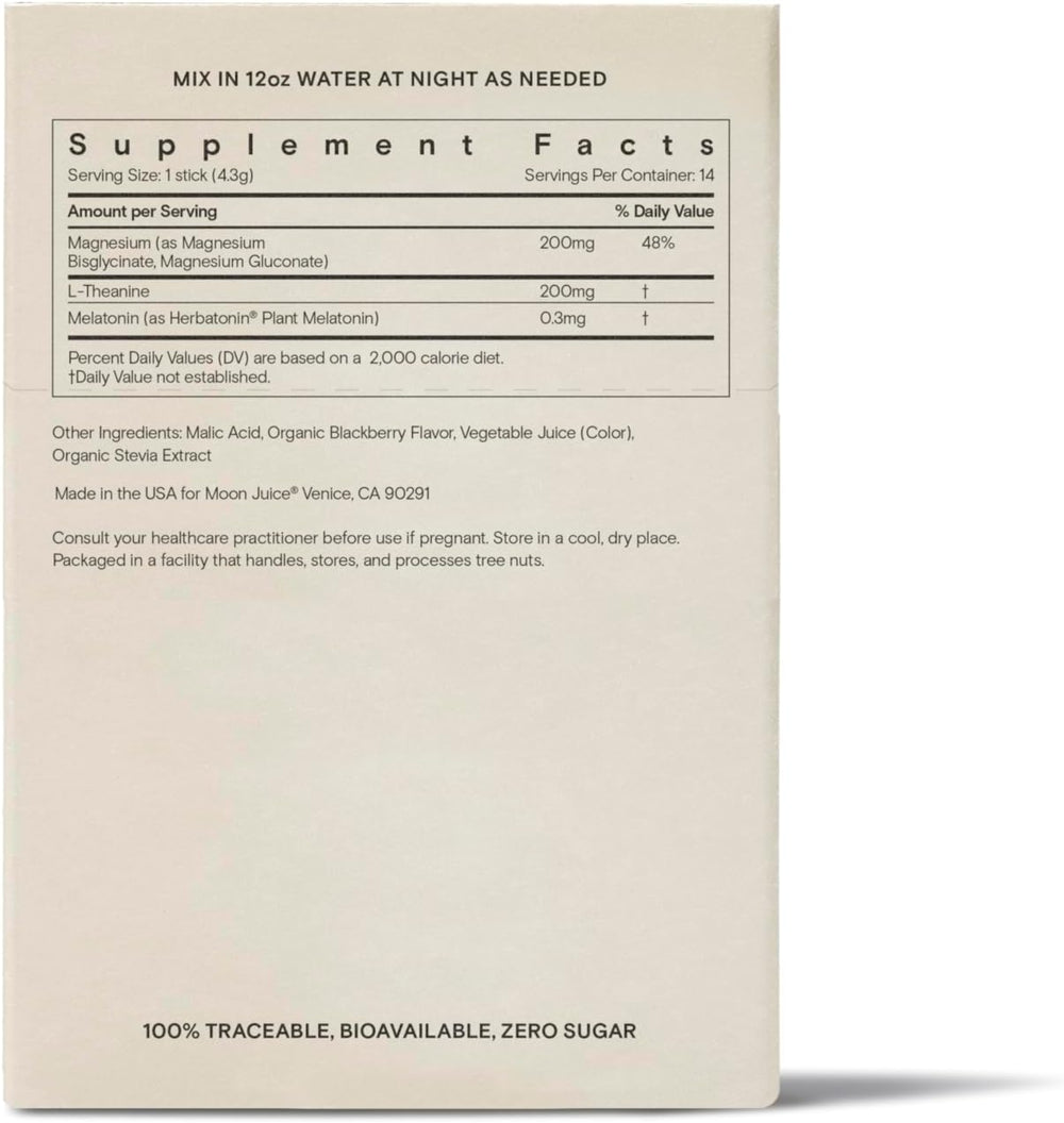 Moon Juice Sabor Blackberry. Recuento de unidades 2.1 Ounce Forma del producto Stick Número de artículos 14 Característica del material Sin Azú Natural Sobre este artículo nina no groggy: A diferencia de dosis más altas de nina que te deja aturdido por la mañ Sleepy Magnesi-Om apoya el sueño sin la resaca. * Nuestra ayuda natural para dormir tiene solo 0.3 mg de nina a base de plantas para disminuir la cantidad de tiempo que lleva conciliar el sueño. * NINA DE PLANTAS: ¿Sabía que la mayoría de la nina proviene de cerebros animales o sintéticos con disolventes tóxicos? Nuestra nina se basa en plantas (fito-nina) y se extrae de Alfalfa y Chlorella cultivadas orgánicamente. Duerme de 3 maneras: Relájate con glicinato de magnesio y glucon déjate llevar con nina de origen vegetal y duerme bien con L-teanina. * CÓMO USAR: Esta ayuda natural para dormir está formulada para ser utilizada según sea necesario. Mezcle en agua de 12 onzas para un insomnio ocasional. Sabe a moras orgánicas. Ingredientes limpios y naturales: este suplemento para dormir es veg sin glu sin azú sin cafeína y sin OMG. De origen sostenible. Sin rellenos ni basura.