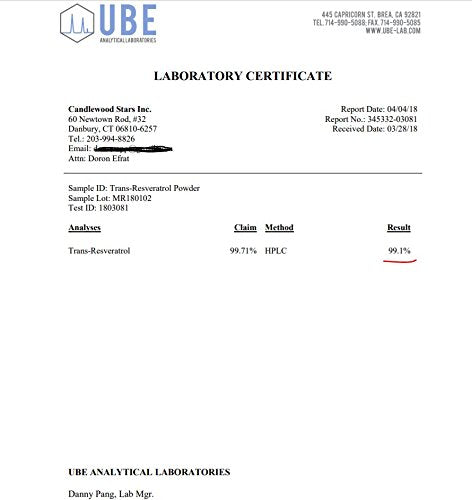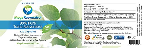 Grado farmacéutico, 99% de resveratrol trans puro Micronizado para una óptima absorción y biodisponibilidad Cada cápsula de 500 mg proporciona 495 mg de trans-resveratrol puro equivale a 450 botellas de vino. 100% natural, 100% vegetariano, sin ingredientes inactivos tóxicos añadidos. Fabricado en EE. UU. Laboratorio de EE. UU. Certificado. TENGA CUIDADO con los productos descritos o Resveratrol 100% puro que no divulgan el contenido de TRANS-resveratrol pureza en la etiqueta de datos del suplemento o que no están probados en pureza.