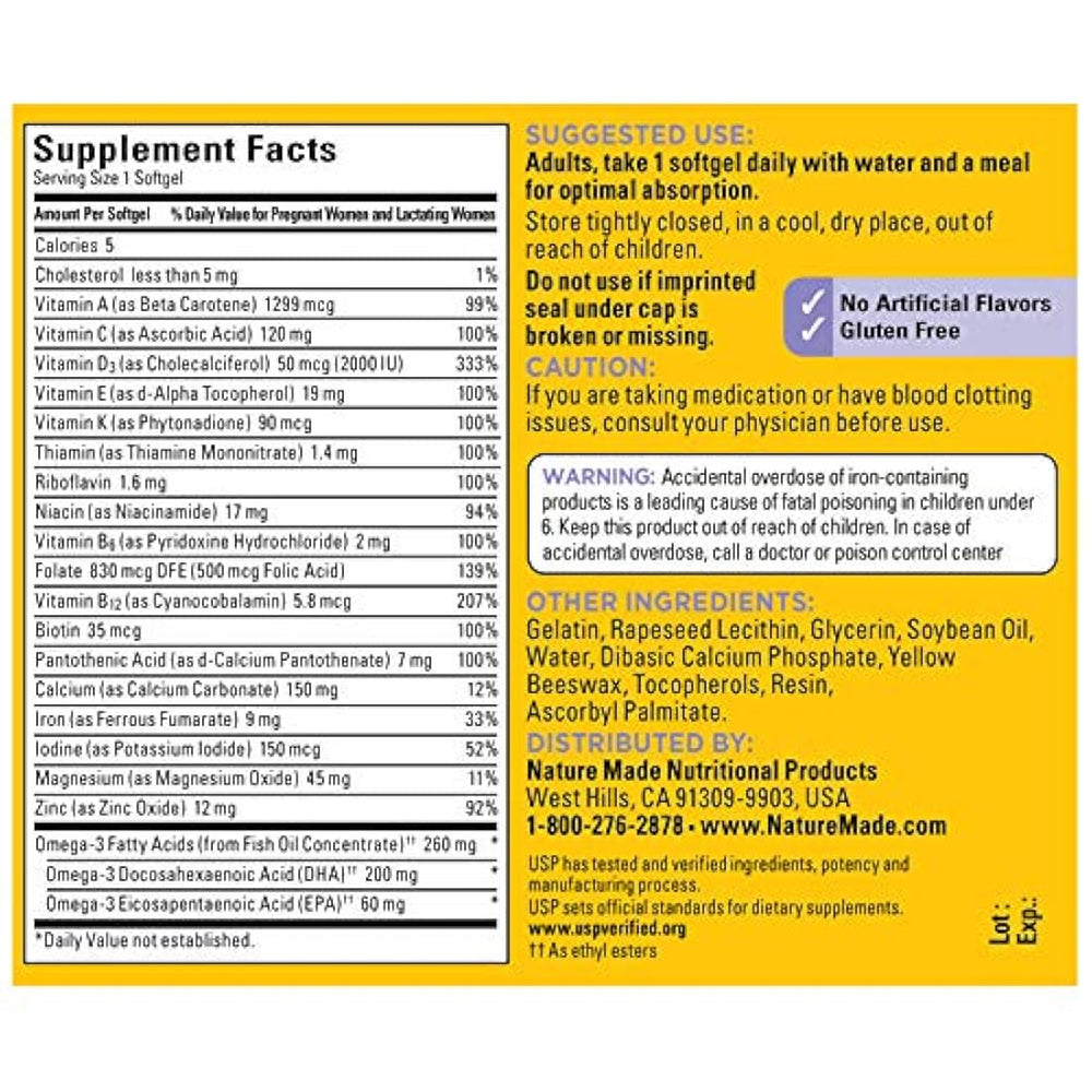 *** Características *** Por un tiempo limitado, puede recibir cualquiera de las botellas mientras actualizamos nuestro embalaje. Ambos tienen el mismo gran producto en el interior. Basado en las nuevas normas de la FDA, también puede notar un cambio en la unidad de medida y/o el valor diario de determinados productos. Contiene un suministro de 60 días de multivitamina posnatal Nature Made + cápsulas DHA Softgels, 60 cápsulas por botella. Diseñado para apoyar las necesidades de nutrición de las madres lactantes. Especialmente formulado para proporcionar una nutrición óptima para mamá y bebé durante la lactancia. Adultos, tome 1 softgel diariamente con agua y una ida para una absorción óptima. Sin tintes sintéticos, levadura y almidón. Garantizado para cumplir con nuestros altos estándares de calidad. Hecho de ingredientes cuidadosamente seleccionados bajo estrictos procesos de fabricación. Sin sabores artificiales, sin gluten. *** Descripción *** Nature Made Postnatal Multivitamin + 200 mg DHA softgels are specially formulated to provide key vitamins and minerals to help meet nutritional needs of nursing moms and their babies in one easy-to-swallow softgel. After your baby arrives, it is important to keep nutritional care top of mind for you and your growing baby. Energy requirements are higher during lactation, and certain nutrients are needed in adequate amounts to support the energy demands while nursing your baby. Postnatal supplementation can help to fill in nutrient gaps and support the enhanced nutrition needs of nursing moms. Nature Made Postnatal Multivitamin + 200 mg DHA contains similar nutrients found in Nature Made Prenatal + DHA softgels. Our postnatal formula contains higher amounts of some key vitamins including A, C, D and E. There are also B vitamins to support cellular energy production and help meet the increased energy demands. Nature Made Postnatal also provides 200 mg of DHA, the omega-3 fatty acid that may help support fetal brain and eye development at levels r mended for nutritional support while nursing your baby.